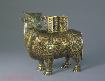 金属胎珐琅工艺的一个品种。即将金属雕錾技法运用于珐琅器的制造中。其工艺过程是:先在已制成的金属胎上按照图案设计要求描绘纹样轮廓线,然后运用金属雕錾技法在纹样轮廓线以外的空白处进行雕錾减地,使纹样轮廓线凸出,再于凹处点施珐琅釉料,经焙烧、磨光、镀金而成。 珐琅,又称“佛郎”“法蓝”“琺瑯”,是一外来语的音译词。珐琅的基本成分为石英、长石、硼砂和氟化物,与陶瓷釉、琉璃、玻璃(料)同属硅酸盐类物质。中国古代习惯将附着在陶或瓷胎表面的称“釉”;附着在建筑瓦件上的称“琉璃”;而附着在金属表面上的则称为“珐琅”。 金属胎珐琅器则依据在制作过程中具体加工工艺的不同,可分为掐丝珐琅器、錾胎珐琅器、画珐琅器和透明珐琅器等几个品种。 牺尊是先秦时期青铜器中的一种礼器,通常为牛形或羊形。 全称“总管内务府”,是清代掌管皇家事物的最高管理机构。始设于清初。顺治十年(1653年)六月裁内务府,改设十三衙门。顺治十八年(1661年)废十三衙门,重设内务府。康熙十六年(1677年)内务府初具规模,下设七司三院:广储司、都虞司、掌仪司、会计司、庆丰司、营造司、慎刑司、上驷院、武备院、奉宸苑,其职能与国家机构中的六部相对应。另有分支机构一百三十余处。