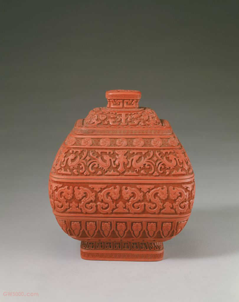 盒的造型为三撞式双贯耳仿古铜壶。通体髹朱漆,雕仿古铜器花纹。从上至下以弦纹界出五区,以回纹、龟背纹、方格花卉锦纹作地,压雕蕉叶、涡纹、凤鸟、夔龙及蝉纹等纹样,底座雕夔凤纹。