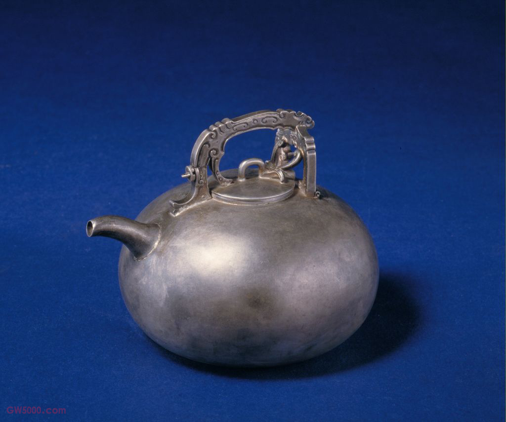 雍正款银提梁壶,清雍正,通高10.2厘米,口径3.2厘米。 壶扁圆形,鼓腹,平底,圆形盖,小短流。口上有弓身螭形小提梁,盖与口间有按钮相连,压按钮则盖可开启。壶通体光素,洁净光亮,壶底正中竖刻篆书“大清雍正年制”六字款,款左侧竖刻篆体“矿银成造”四字铭文。 故宫博物院收藏此类银壶仅两件,其造型小巧玲珑,螭形提梁形象生动,做工精湛,尤其是壶盖开关处的设计独特巧妙,不知者不易将盖打开。整个壶面虽无纹饰,但独具一格,是雍正朝银器的成功之作。 提梁壶与鸡冠壶、皮囊壶为辽代北方游牧民族使用的特殊器形之壶,用以盛放酒或水,形状模仿皮制囊壶造型,便于携带。