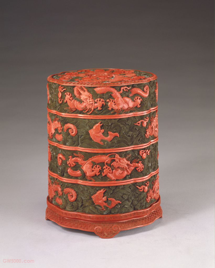 盒呈葵瓣式口,三撞式,底承四个如意头形矮足。通体髹绿漆雕海水,红漆雕鱼、龙纹。盖面雕饰正面龙纹,盒壁雕鱼、龙在绿波中追逐飞动的火球,形体若隐若现,变幻无穷,构成了“鱼龙变幻”的图景。盒内髹黑漆饰描金折枝花纹,底髹黑漆,无款。
