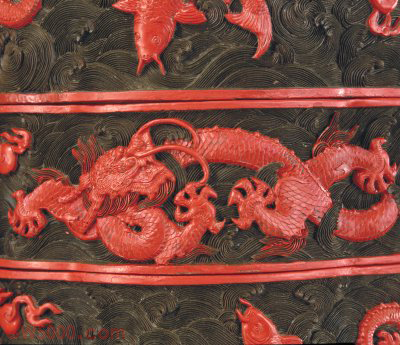 此器刀法纤细,雕工娴熟,工艺精湛。所雕的红漆鱼、龙隐现在绿色漆中,不同以往,在绿漆上局部加饰红漆后再雕刻鱼龙纹,这是清代中期雕漆工艺的新发展。