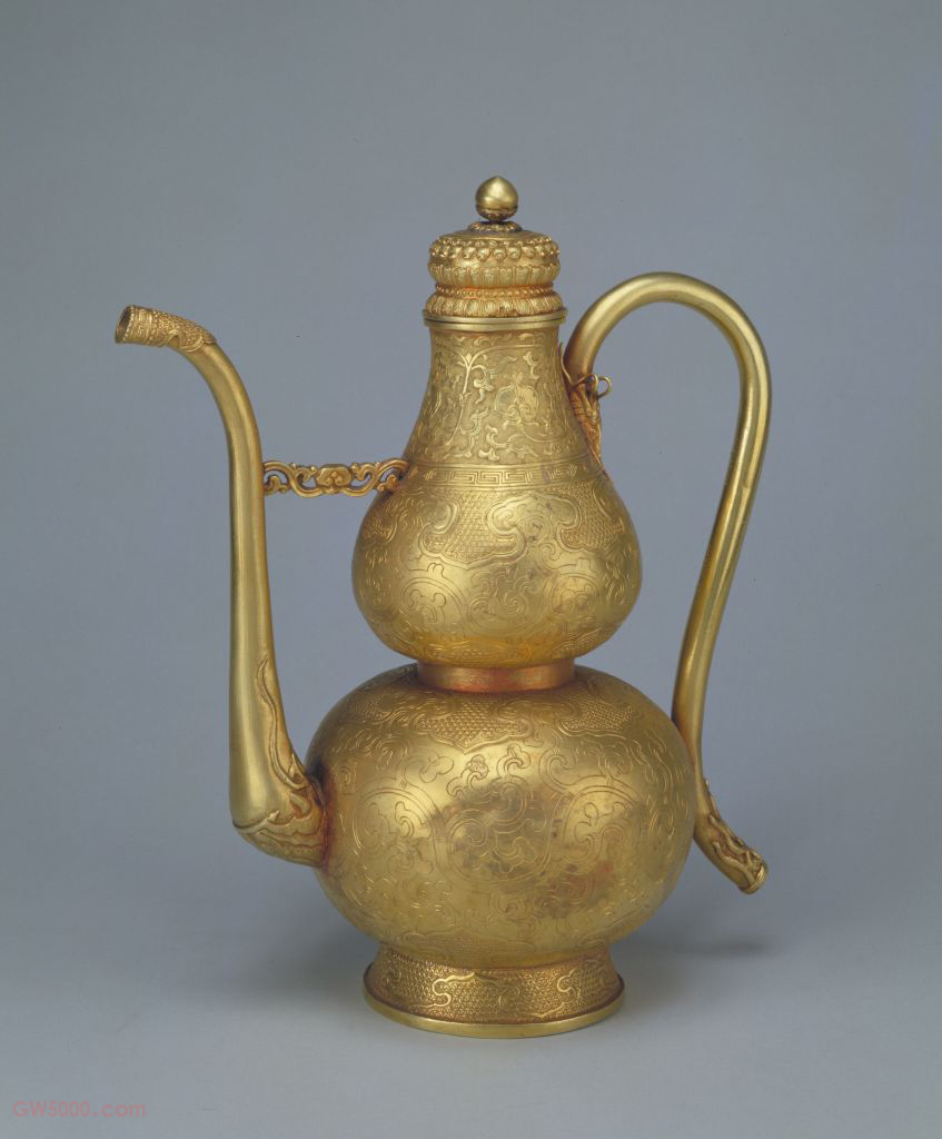 金錾花葫芦式执壶,通高30.4厘米,柄流最宽处27厘米,足径10厘米。 壶呈葫芦形,兽吞式流,龙形柄,扁圈足。盖上饰花蕾形钮。器身上以錾刻和镂雕的技法雕刻云龙纹,器底刻铭文“四十六两六钱五分”。 此金执壶是清代皇帝的御用酒具,其上錾刻的图案豪华富丽。我国古代金工传统工艺之一。用小锤敲击各种大小不同的金属錾子,在金属表面留下錾痕,形成各种不同的纹理,使单一的金属表面产生多层次的立体装饰效果。此种工艺始于春秋晚期,盛行于战国,至今依然为匠师们沿用。 一种酒器。最早为瓷质的,出现于中唐时,当时称注子。唐代执壶硕腹,喇叭口,短嘴,壶的重心在下部。后壶体渐瘦长,重心向上提,五代至宋时壶体多为瓜棱式,往往与注碗成套使用。从元代开始,执壶的壶体呈玉壶春瓶式,壶流弯曲而细长,景德镇窑与龙泉窑都有烧制。明清时期,形式变化不大,并开始出现玉、珐琅、金银等质地的执壶。 器皿装饰的一种样式,常见于铜器、金银器、玉器中。多出现在器物的耳、柄部位。其造型特点主要为兽头与长柄组合,兽口大张,长柱自兽口中吐出,曲而呈弧状,兽颈及柱的下端接于器身。金属工艺的一种。即用工具剔除地纹,使纹饰轮廓线凸起。錾金工艺技法早在商代就已出现,到清代,被广泛地运用于各种金属工艺品上。1.雕塑的表现手法之一,即在浮雕的基础上,为了生动地表现物象,局部圆雕,使其脱离背景,形成镂空。 2.瓷器装饰技法之一,也称“镂花”、“镂空”或“透雕”。将装饰花纹雕空,形成内外通透的图案。此技法出现在新石器时代陶器上,后在瓷器纹饰上广泛使用。 陶瓷器装饰纹样之一种。明、清两代是陶瓷器以龙纹为装饰的全盛时期,主要采用釉上、釉下彩绘方法,亦有印花、刻划等工艺。龙的体态有较多变化,常见有云龙、戏珠龙、海水龙、螭龙、行龙、立龙、正面龙、侧面龙、夔龙等。