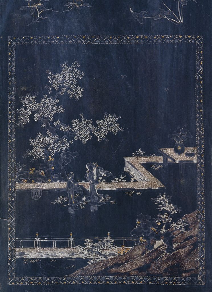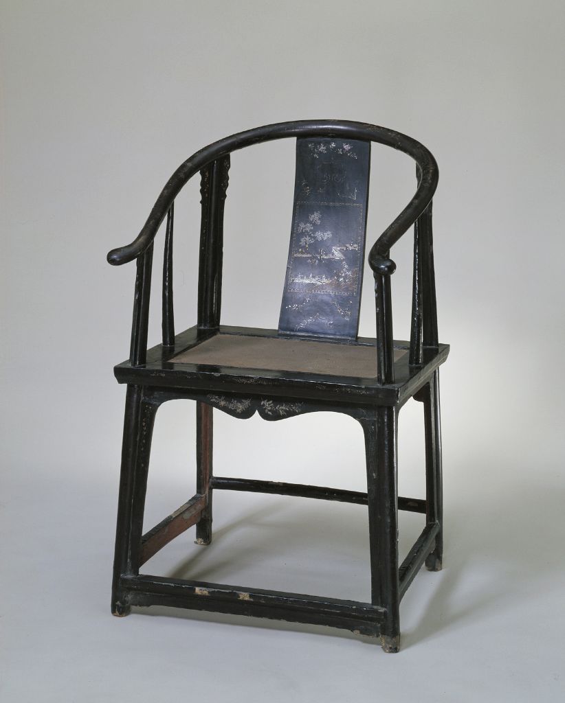 清,高107厘米,宽64.5厘米,纵48.5厘米。 此椅通体髹黑漆,背板处嵌软螺钿桐荫仕女图,席座面下正面壸门券口装饰折枝花卉纹。椅四腿侧脚收分明显,具明式风格。软螺钿镶嵌,即指以夜光螺、贝壳等进行镶嵌的工艺技法,其螺钿片极小,多为五彩,因此又被称为五彩螺钿、薄螺钿。 中国传统装饰工艺之一,即指将螺、贝、蚌等软体动物的体壳加工成薄片,刻划并拼组成花草、人物、鸟兽等纹样,镶嵌于漆、木等器物表面的装饰技法,也作“螺甸”、“螺蜔”、“螺填”、“陷蚌”等。其起源甚早,在陕西、河南、北京等地发掘的西周墓葬里都出土过镶嵌蚌泡的漆器,有的学者认为这就是螺钿工艺的滥觞,目前所见比较成熟的螺钿器物是出土于唐墓内的漆背螺钿铜镜和收藏在日本奈良正仓院的螺钿玳瑁八角盒、螺钿紫檀琵琶等。宋代的螺钿器物比较普遍,《髹饰录》所记的“壳片古者厚而今者渐薄”的薄螺钿(或称软螺钿)工艺,一般认为就是在此时开始出现,并逐渐占据主流位置,同时厚螺钿(或称硬螺钿)工艺也并未消失,在大型家具的装饰中还形成独特风格。元明时期,螺钿工艺所使用的贝壳品种更为丰富,加工更为精细,发展出加彩漆、描金、金箔、金银嵌错和加“沙”(即撒壳屑)等辅助手法,创造出五色斑斓的效果,正如《髹饰录》所言:“百般文图,点、扶、钩、条,总以精细密致如画为妙。”至17世纪,螺钿工艺达到高峰,产生了江西吉安等主要产地,涌现出江千里、方信川等著名匠人。入清后,薄螺钿工艺进一步向轻巧细致发展,受嵌器物的材质也趋于多样,除漆、木外,玉石、象牙、金属等都有嵌螺钿装饰的实例。清中期以后,螺钿作为百宝嵌工艺中诸多镶嵌材料的一种,往往与宝石、玉翠、象牙等共同出现,单独的螺钿器反而少见了。清代螺钿工艺产地可能集中在扬州、广州等地,内廷造办处也能制作,名匠见诸记载的则有王国深、卢映之、卢葵生等人。宫内小巷道称壸(音捆),此处为家具术语之一。通常在横牙正中开一尖口,再向两侧曲线延伸与竖向牙条相交,此种作法称为劵口;如果牙条四面相交,则每面正中均开尖口,此种作法称为圈口;如果只有一面横牙条作出壸门装饰,则称为壸门牙子。将三根板条安装在方形或长方形的框格中,形似拱券状,故名。指家具腿足下端向外叉开。 我国古代金工传统工艺之一。铸造铜器时,在需镶嵌部位表面铸成线槽,将松石、红铜片或金银丝、片嵌入凹槽,再打磨平滑。镶嵌工艺始于二里头文化时期,在春秋时期较盛行。 将贝壳裁切加工成纸一般的薄片,通常称薄螺钿,又名软螺钿。