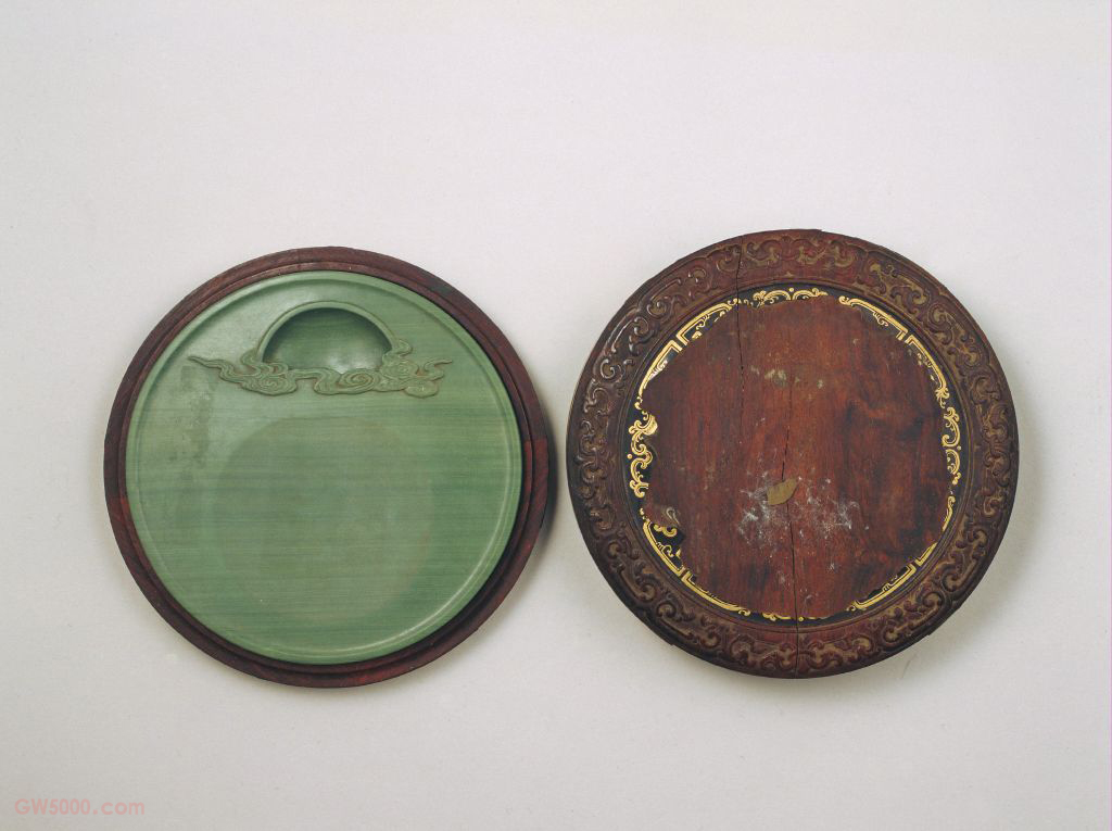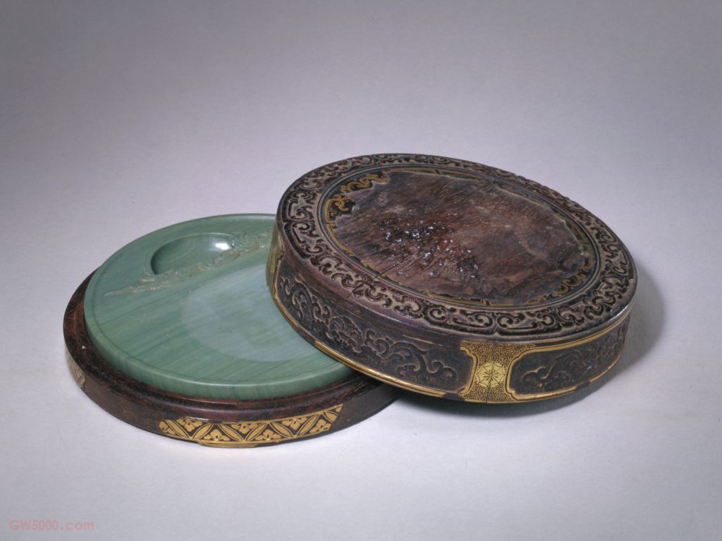 此砚装潢考究,黑漆描金花卉圆砚盒随砚形而作,盒盖面花边装饰繁复华丽,颇具宫廷特色。又名松花石,据《西清砚谱》记载:“松花石出混同江边砥石山,绿色,光润细腻,品  端歙,自明以前无取砚材者,故砚谱皆未载之。我朝发祥东土,扶舆磅礴之气,应候而显,故地不爱宝,以翊文明之运,自康熙年至今,取为砚材,以进御者。”混同江即今松花江。