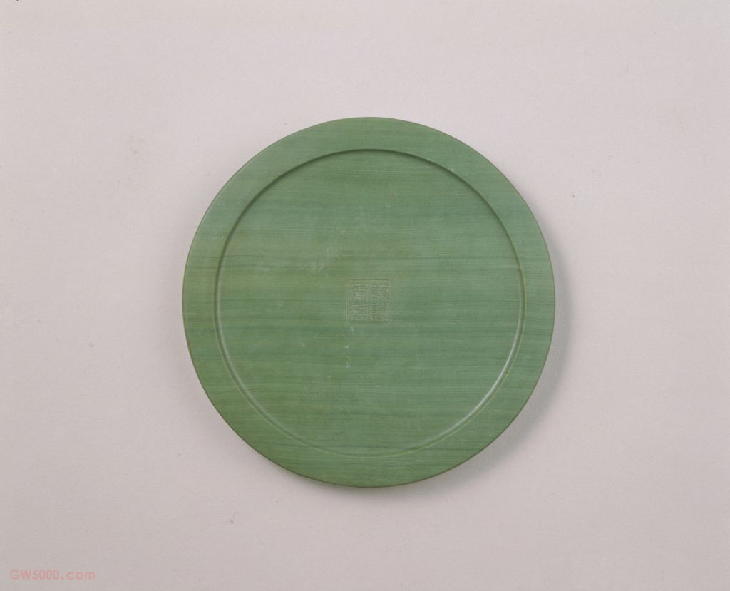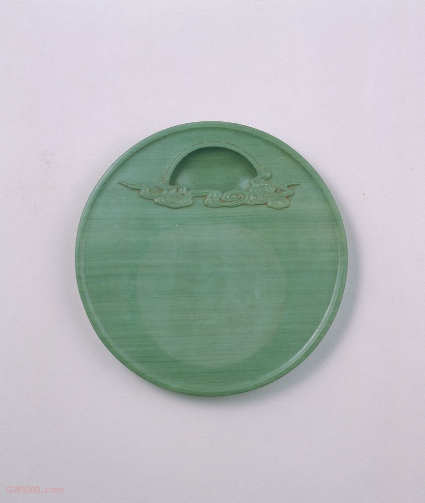 砚圆形,为松花江石制成,石质细腻,色绿,丝丝纹理深浅相间,自然天成。砚面巧作云纹半圆池,仿佛云中旭日,匠心别具。砚背面署篆书“乾隆年制”款印。砚石雕琢工整简洁,以石质取胜。