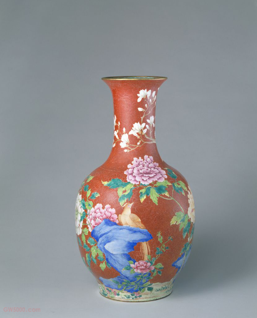 该瓶体量硕大,在画珐琅作品中少见,又以红色珐琅为地,使画面色彩浓重艳丽,烘托出热烈的装饰效果,也是少见。