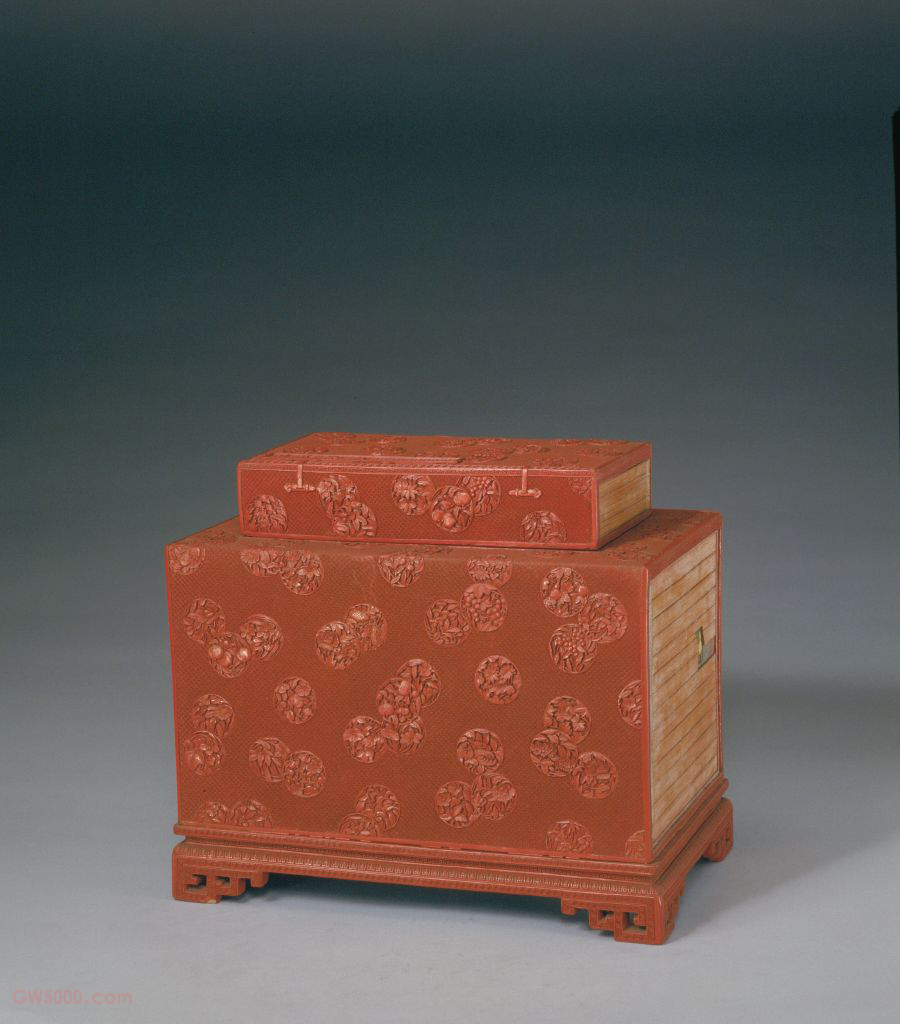 剔红团花书函式匣,清中期,高30厘米,长32.7厘米,宽20.2厘米。清宫旧藏。