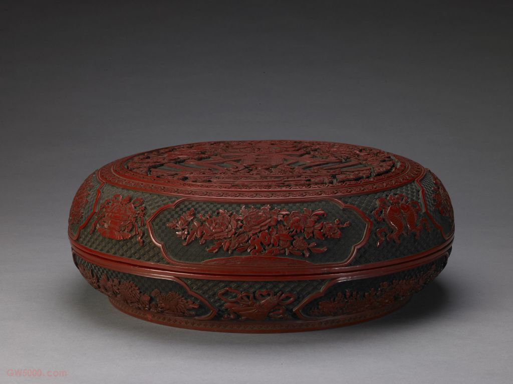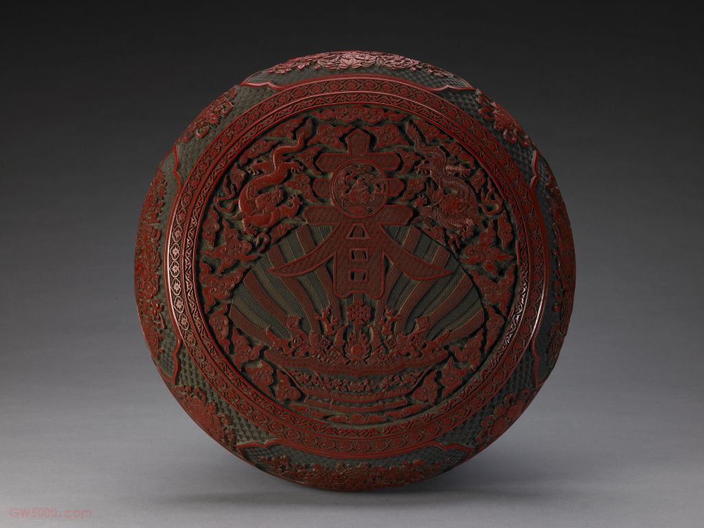此盒形制与装饰图案与明代嘉靖雕漆“剔彩春寿字圆盒”如出一辙,为清中期仿嘉靖雕漆的代表作品。但此盒的艺术风格已与嘉靖雕漆明显不同,不仅龙的形象具清中期龙纹的特征,而且雕刻的刀工遒劲迅疾,犀利准确,少有瑕疵,为嘉靖雕漆所不能及。 我国传统装饰技法之一。即为使器物上的装饰变化多样或突出某一形象,往往在器物的某一部位勾勒出某一形状(如扇形、蕉叶形、菱形、心形、桃形、圆形等)的空间,其内饰以图纹。