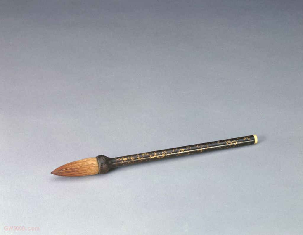笔为紫檀木管,饰以黑漆描金缠枝花卉,信手勾绘,线条流畅。紫檀木斗深褐色沉稳,饰以朵花纹,制作精致。笔斗纳毫为貂毫,束毫丰满,齐而圆健。提笔带斗可纳粗毫,是清代较为流行的笔式,适宜书写硕大的字体。在黑色漆地上加描金花纹的工艺技法。瓷器装饰手法之一。其工艺是以毛笔蘸调和好的金粉,在烧好的瓷器上描绘图案花纹,然后入炉经低温烘烧而成。描金创烧于北宋定窑,南宋人周密《志雅堂杂钞》记载:“金花定碗用大蒜汁调金描绘,然后再入窑烧,永不复脱。”用大蒜汁调和金粉是利用其天然的粘性。明清的景德镇御窑厂亦常用描金装饰颜色釉瓷器,如著名的宣德鲜红釉描金器、弘治黄釉描金器、乾隆窑变釉描金器等。