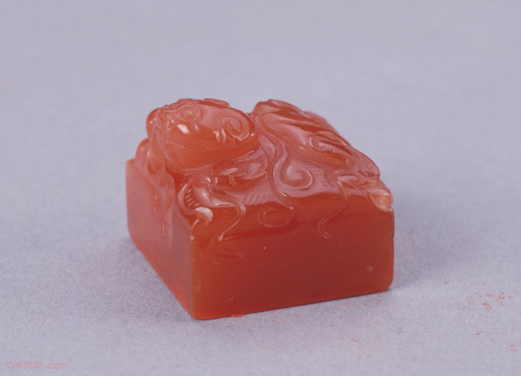 “菑畬经训”印,清雍正(乾隆为宝亲王时期),玛瑙质,螭纽方形玺。篆书。面1.8厘米见方,通高1.6厘米,纽高0.9厘米。