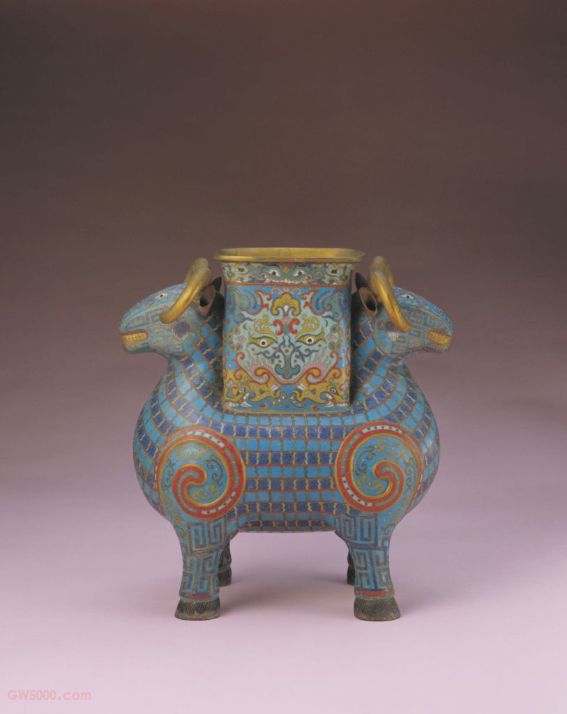 掐丝珐琅双羊尊,清晚期,高36厘米,长34厘米,宽16.5厘米。 尊的造型为双羊联体,一身之上设方向相背的两个羊首,背驮一方形尊,双羊的前腿构成器物的四足。耳、角、牙齿为铜鎏金质。羊身饰条带形锦纹,蓝色珐琅深浅间隔,整齐划一,肩饰红色旋转纹,腿饰回纹,方形尊上饰兽面纹。 该器掐丝均匀,纹饰工整,鎏金厚实,造型与装饰花纹新颖别致,在掐丝珐琅器中罕见。俗称“景泰蓝”。以红铜作胎,将很细的铜扁丝掐成花纹后用药焊于器表,再以随类附彩的方法将珐琅釉料填进丝间,经焙烧、打磨、镀金而成。 珐琅,又称“佛郎”“法蓝”“琺瑯”,是一外来语的音译词。珐琅的基本成分为石英、长石、硼砂和氟化物,与陶瓷釉、琉璃、玻璃(料)同属硅酸盐类物质。中国古代习惯将附着在陶或瓷胎表面的称“釉”;附着在建筑瓦件上的称“琉璃”;而附着在金属表面上的则称为“珐琅”。 金属胎珐琅器则依据在制作过程中具体加工工艺的不同,可分为掐丝珐琅器、錾胎珐琅器、画珐琅器和透明珐琅器等几个品种。兽面是古代人们想象中的怪兽的面部,将其刻画在器物上所形成的纹饰称兽面纹。宋代的学者把兽面纹称为饕餮纹。
