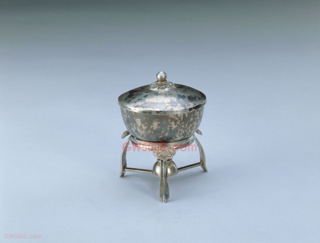 银温酒器,通高8.8厘米,口径6.5厘米。清宫旧藏。 温酒器银质,似今酒精炉之结构,整器由支架和盖杯两部分组成。架为3足托一圆盘,用于盛放酒精等液体燃料。支架上置圆盆形盖杯,杯内可盛酒,加热后饮用。 此温酒器做工精巧,造型新颖别致,应为清代中晚期作品。