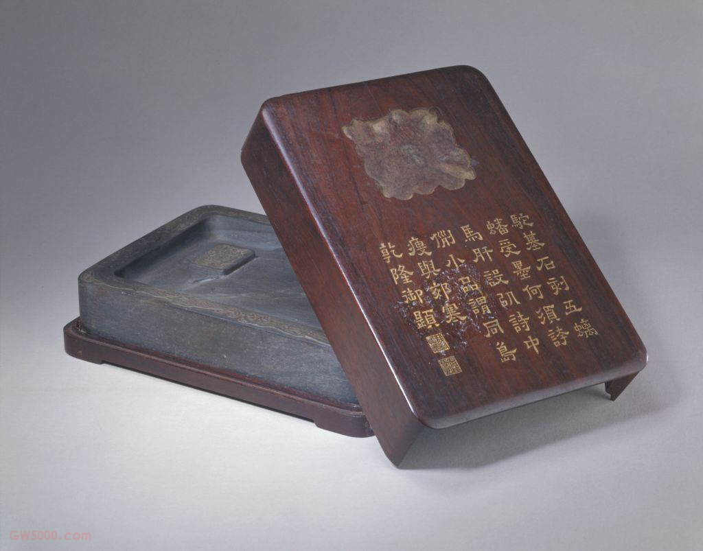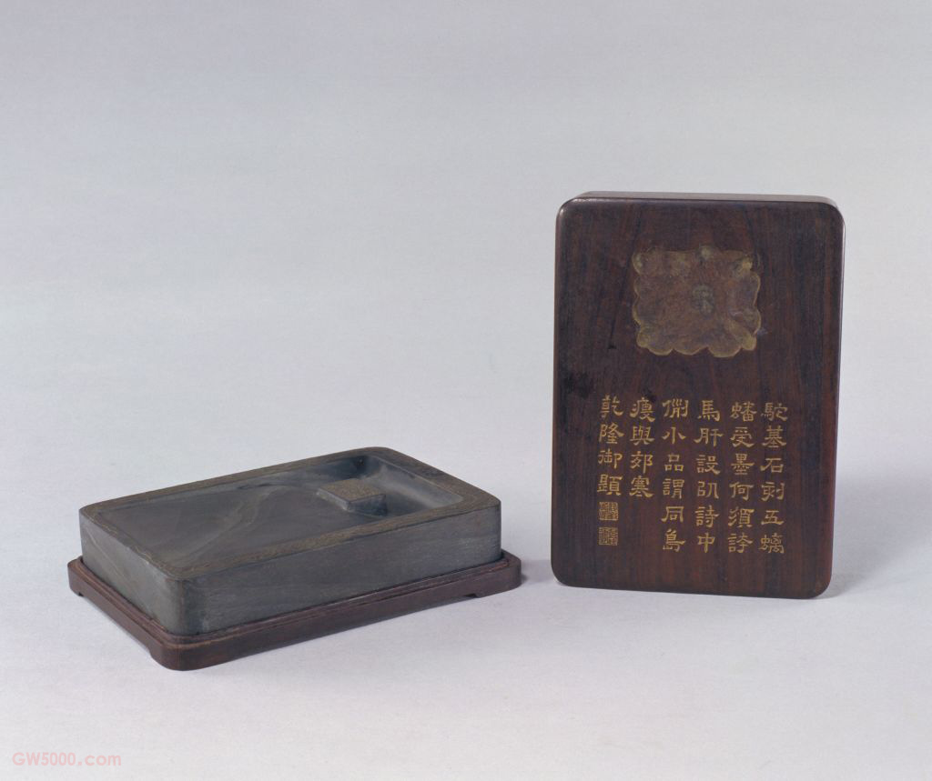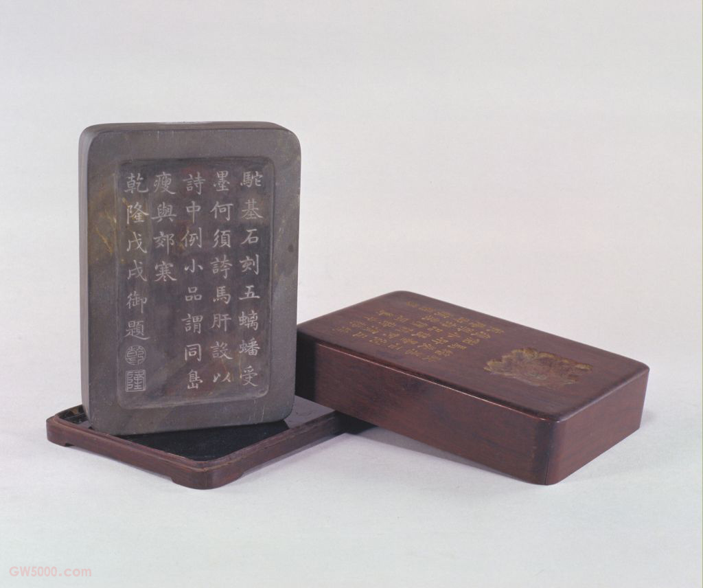 御铭驼矶石砚,清乾隆,长18.3厘米,宽12.7厘米,厚3.2厘米。 砚为驼矶石,造型呈长方形。砚堂宽平,墨池深广,池内凸雕五螭戏珠纹。背面镌刻乾隆皇帝御题砚铭“驼基石刻五螭蟠,受墨何须夸马肝,设以诗中列小品,谓同岛瘦与郊寒。乾隆戊戌御题。”并“乾”、“隆”二印。戊戌,即乾隆四十三年(1778),乾隆帝时年68岁。 砚盒内饰以黑漆,盒盖原嵌玉已失,盖面填金隶书御题砚铭与石砚铭相同,并篆书“几暇怡情”、“得佳趣”两方御用闲章。 驼矶石,原产于山东蓬莱砣矶岛。宋髙似孙《砚笺》称:登州砣基岛石色黒,罗纹金星,发墨类歙。 此砚石质细润发墨,色青紫,表面闪烁金星,隐现石肌纹理斑斓。为乾隆皇帝御赏砚,著录《钦定西清砚谱》卷二十三。驼矶石产于山东烟台砣矶岛,石料呈青灰色,内含金属颗粒、云母、绿泥石和少量的石英等矿物质。加工雕刻成砚后色泽如漆,油润细腻,视之如金星闪烁,雪浪翻腾,具有研不起沫、泼墨如油、不渗水、不损耗等特点,深受古今文人墨客之赞誉。砚的中心研墨处。为砚较为空白开阔的部位,又称墨堂、砚心。此处便于研墨,利于旋转,易于运动。砚的实用价值即视砚堂处石质的好坏而定。 指驼基石,产于登州(今山东境内)驼基岛,青黑色,有金星、罗纹,纹理斑斓。驼基石砚传世极罕。镌刻诗词成语的印章,一般钤盖在书页上。为区别于公章与名章,故称为闲章。 于敏中(1714-1780年),字叔子,号耐圃,江苏金坛人。乾隆朝状元。曾历任内阁学士,兵部、刑部、户部侍郎,军机大臣等职,颇受乾隆皇帝的信任,又授文华殿大学士衔,任上书房总师傅,《四库全书》馆总裁。于敏中聪颖过人,乾隆御制诗多有由他聆听后笔录定稿。因久参机要,与外官相勾结,收受贿赂甚多。后因病卒。著有《国朝宫史》、《素余堂集》。清乾隆朝编著的清内府藏砚的图谱,全书分为二十四卷,集萃清内府藏砚二百余方,上起汉代,下迄清乾隆朝新制。乾隆钦定凡例,每砚皆图、说并茂。“西清”为清代宫内南书房的别称。