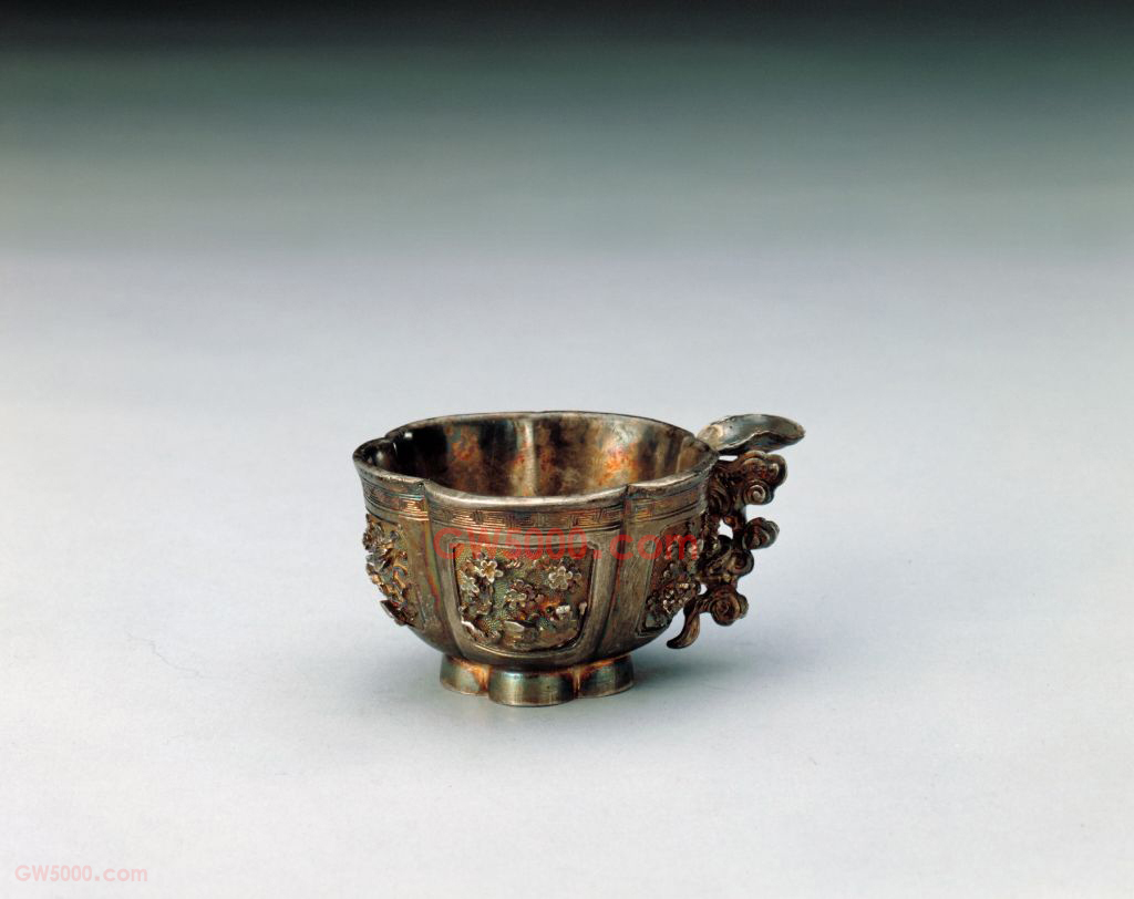 银錾花梅花式杯,清,高3.3厘米,口径5.5厘米,足径2.7厘米。清宫旧藏。 杯银质,口呈五瓣梅花状葵口,足亦为梅花形。杯身五5个委角开光内各錾刻凸起的花朵为饰,杯柄镂雕花及花叶。 清代金、银器加工在继承前代工艺的基础上继续发展,技术更加精湛,尤其是康熙和乾隆时期,金银錾刻工艺更趋于华贵富丽的风格,装饰效果极强。此杯造型精巧,雕琢细腻,反映出清代金银器加工制作的工艺水平和风格特点。我国古代金工传统工艺之一。用小锤敲击各种大小不同的金属錾子,在金属表面留下錾痕,形成各种不同的纹理,使单一的金属表面产生多层次的立体装饰效果。此种工艺始于春秋晚期,盛行于战国,至今依然为匠师们沿用。 家具中线角术语。一般的桌面、几面、案面均为直角,将四个直角改为小斜边而成八角形的做法,北方木工称为“委角”,江南木工称“劈料做”。 我国传统装饰技法之一。即为使器物上的装饰变化多样或突出某一形象,往往在器物的某一部位勾勒出某一形状(如扇形、蕉叶形、菱形、心形、桃形、圆形等)的空间,其内饰以图纹。 金属工艺的一种。即用工具剔除地纹,使纹饰轮廓线凸起。錾金工艺技法早在商代就已出现,到清代,被广泛地运用于各种金属工艺品上。1.雕塑的表现手法之一,即在浮雕的基础上,为了生动地表现物象,局部圆雕,使其脱离背景,形成镂空。 2.瓷器装饰技法之一,也称“镂花”、“镂空”或“透雕”。将装饰花纹雕空,形成内外通透的图案。此技法出现在新石器时代陶器上,后在瓷器纹饰上广泛使用。 雕漆主要工艺之一,又称雕工。即先在器物上髹漆若干层后,再凭漆之厚度来雕刻花纹。