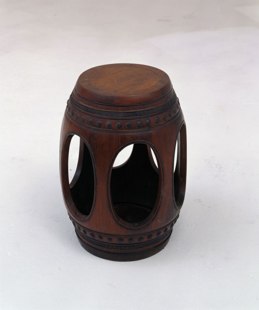 清早期,高46.5厘米,面径27.5厘米。 绣墩的坐面攒框镶心。腹腔向外膨出,一周均匀地开出六个椭圆形开光洞,并用紫檀木镶边。开光洞上下对称装饰弦纹各四道,其中最外的两道用紫檀木镶成,上下对称的第三、四道为双线,双线中的一条亦为紫檀木嵌成,上下第二、三道弦纹之间随形嵌紫檀木,上浮雕回纹,第三四道弦纹之间饰鼓钉纹一周。坐墩下附圆环托泥,里侧镶底。 此坐墩造型美观,纹饰匀称,庄重大方,具有较高的艺术价值。古代一种常用的坐具,因其上面常覆盖一方丝绣之物而得名,又名“锦墩”、“鼓墩”或“坐墩”,可用草、藤、木、漆木、瓷、石等材质制成,造型多种多样,往往在亲友交往等非正式场合中使用。 中国古代家具上用攒边方法做成的框称为攒框。家具板面通用的一种传统作法。由大边、抹头、穿带和面心组成,面心四边作出榫舌,大边和抹头作出榫槽,将面心镶在榫槽内,木工术语称之为“攒框镶心”。指墩类家具中间最粗的部位。 我国传统装饰技法之一。即为使器物上的装饰变化多样或突出某一形象,往往在器物的某一部位勾勒出某一形状(如扇形、蕉叶形、菱形、心形、桃形、圆形等)的空间,其内饰以图纹。 将图案画在圆形、方形或其它形状的轮廓中俗称“开光”。将开光镂空称“开光洞”。紫檀木是世界上最名贵的木材之一,主要产于南北回归线之间的热带、亚热带地区,我国广东、云南等地有少量出产。其木质坚硬,体重,入水即沉,没有疤痕,呈紫黑色。紫檀木生长缓慢,非数百年不能成材,故极珍贵。紫檀木的纹理纤细浮动,变化无穷,其色调深沉,显得稳重、大方、美观。《博物要览》称:“新者色红,旧者色紫,有蟹爪纹,新者以水浸之,可染物。”我国古代使用紫檀木制作器物历史悠久,东汉末年已见于记载,唐代宫廷中亦有使用紫檀木的记载。至明代,紫檀木更是受到皇家的宠爱。清代,紫檀木大量进入宫廷中,为内务府造办处用于制作清宫家具及文玩之器的必备材料,同时一些富商大贾之家也多使用名贵的紫檀木制造家具及生活用品。 古器物上最简单的传统纹饰,在青铜器上呈现为凸起的横线条。大多数情况下,弦纹是作为界栏出现的。在陶瓷等器物上亦有专用弦纹装饰者。 在平面上雕出凸起的纹饰或物象的一种雕塑。按凸起高度的不同,可分为高浮雕、深浮雕、浅浮雕等,也有几种雕刻技法结合使用的形式,多见于高精繁杂的雕刻作品。 家具上常用的纹饰之一,由陶器和青铜器上的雷纹衍化而来,寓意吉利深长,苏州民间称之为“富贵不断头”。在家具上,回纹主要作为边饰,用于边框、牙条、足端或束腰等处。家具上大量采用回纹见于清代。家具的圆形底部装饰的圈足称“圆环托泥”。传统家具上承接腿足的部件。明清家具中有的腿足不直接着地,另有横木或木框在下承托,此木框即称为“托泥”。有的托泥之下还有小足,小足才是真正落地的部位。此部件多见于条案、几类等传统家具,以增稳重之感。