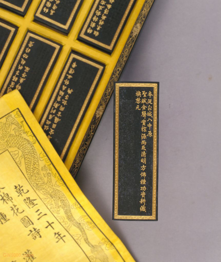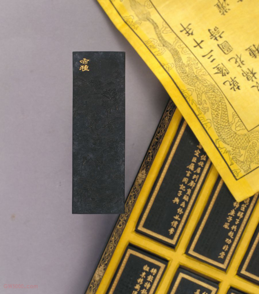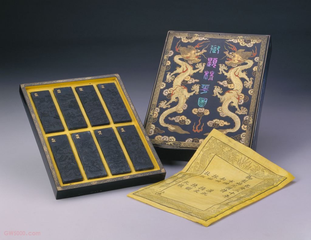 此套墨为乾隆三十年(1765年)御制,装于一黑漆描金双龙戏珠纹盒中,分上下函装,制作极精致。在黑色漆地上加描金花纹的工艺技法。瓷器装饰手法之一。其工艺是以毛笔蘸调和好的金粉,在烧好的瓷器上描绘图案花纹,然后入炉经低温烘烧而成。描金创烧于北宋定窑,南宋人周密《志雅堂杂钞》记载:“金花定碗用大蒜汁调金描绘,然后再入窑烧,永不复脱。”用大蒜汁调和金粉是利用其天然的粘性。明清的景德镇御窑厂亦常用描金装饰颜色釉瓷器,如著名的宣德鲜红釉描金器、弘治黄釉描金器、乾隆窑变釉描金器等。