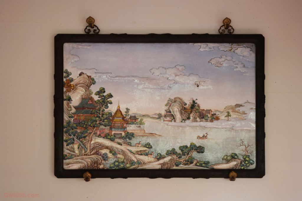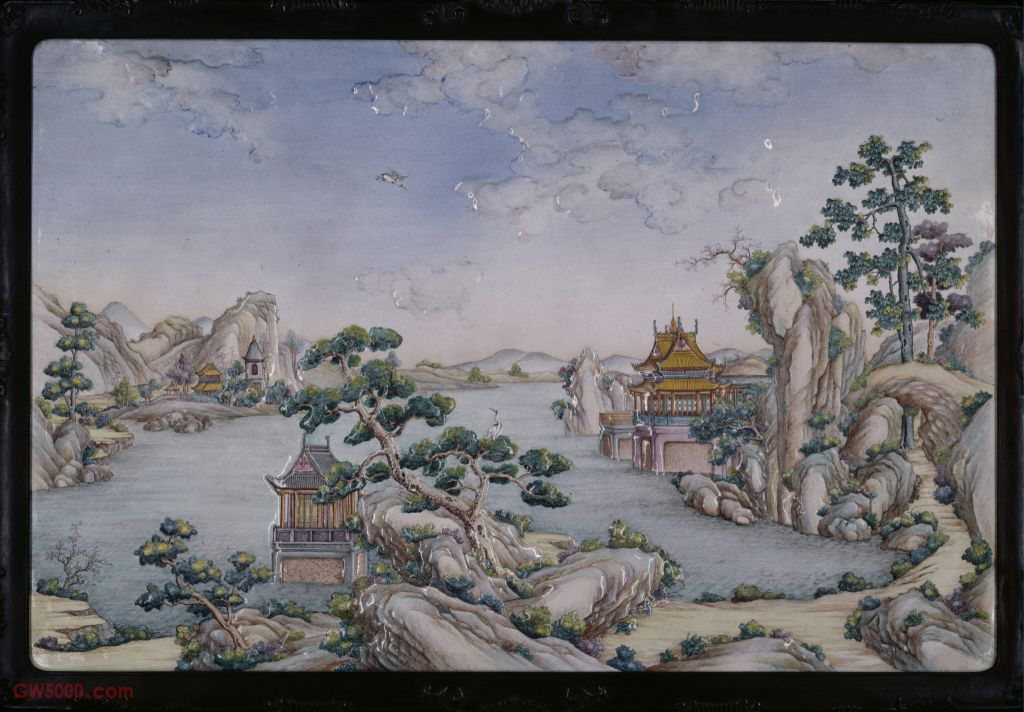 锤胎画珐琅山水楼阁图挂屏,清中期,长110厘米,宽76厘米。清宫旧藏。 挂屏为一对,铜胎。制作方法是先以金属锤胎技法锤揲成图案的轮廓,然后用画珐琅工艺作表面的装饰。屏中的山水林木、亭台楼阁、云中仙鹤、地面鸣鹿构成了一幅寓意“鹤鹿同春”、“松鹤延年”的吉祥画面。此屏由于采用了锤胎珐琅工艺,所以图案颇具立体效果。金属胎珐琅工艺之一。作法是先在红铜胎上涂白珐琅,入窑烧结后,在其平滑的表面以各色珐琅料及金绘画图案,再经焙烧而成。这种工艺晚于錾胎和掐丝珐琅,是清康熙年间(1662—1722年)在欧洲画珐琅工艺的影响下烧制成功的。 珐琅,又称“佛郎”“法蓝”“琺瑯”,是一外来语的音译词。珐琅的基本成分为石英、长石、硼砂和氟化物,与陶瓷釉、琉璃、玻璃(料)同属硅酸盐类物质。中国古代习惯将附着在陶或瓷胎表面的称“釉”;附着在建筑瓦件上的称“琉璃”;而附着在金属表面上的则称为“珐琅”。 金属胎珐琅器则依据在制作过程中具体加工工艺的不同,可分为掐丝珐琅器、錾胎珐琅器、画珐琅器和透明珐琅器等几个品种。唐代诗人王建《闲说》诗云:“鹤寿千年也未神”。因鹤、鹿长寿,故常以“鹤鹿同春”用于祝寿之辞。因松、鹤长寿而常将二者并题,用于祝寿之辞。金属工艺的加工方法之一。系将较薄的金属板置于花模上锤打,使其表面呈现出凸起的花纹,然后施绘多彩的珐琅釉,再经焙烧、镀金、磨光等加工程序方告完成。