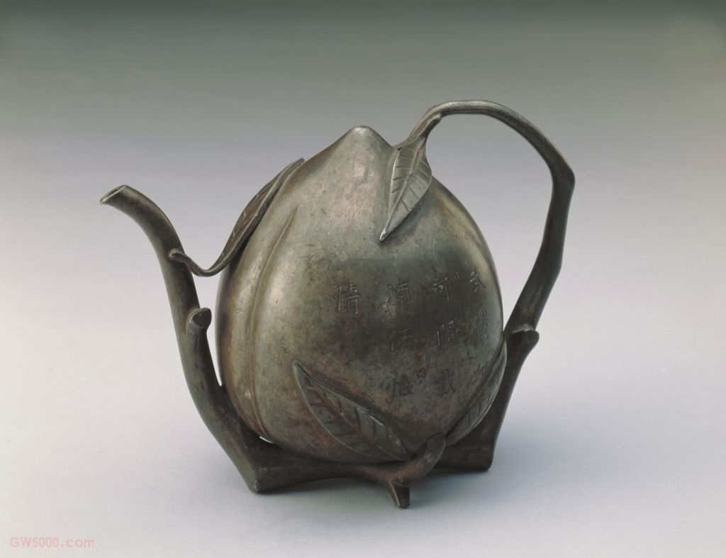 桃式倒流锡壶,清,通高12.9厘米。 壶锡质。壶体为硕大的桃形,流、柄均作桃枝状,壶底有圆口。腹部一面刻有诗句:“武陵如可问,载酒任怡情。”另一面刻:“一枝娇欲助”及“王胜万制”名款。 此壶的特点在于“倒流”,因壶上无口,使用时需先将壶倒置,由壶底的圆口注入酒液,再翻转过来往杯中注酒,因而得名“倒流壶”。此壶造型最早出现于宋代瓷器中,这件锡制壶即以瓷壶为蓝本创作而成。 郡名。《汉书·地理志》:“武陵郡,高帝置,莽曰建平,属荆州。”《续汉书·郡国志》:“武陵郡,十二城。“武陵”一词出现在文学作品中常用于指代“桃花源”。) <br /> <br />酒壶的一种,为宋代的创新品种,在设计上有独到之处,类似于今天的汽锅。注酒时需从壶底中心的小孔注入,壶底小孔与壶内的隔水管相通,隔水管上孔高于酒面,构造有如今日厨具汽锅的汽嘴。当酒壶正置时小孔不漏酒。壶嘴下有隔水的管壁,倒酒时酒不会溢出。这种反注正倒的方法独具匠心,堪称一绝。