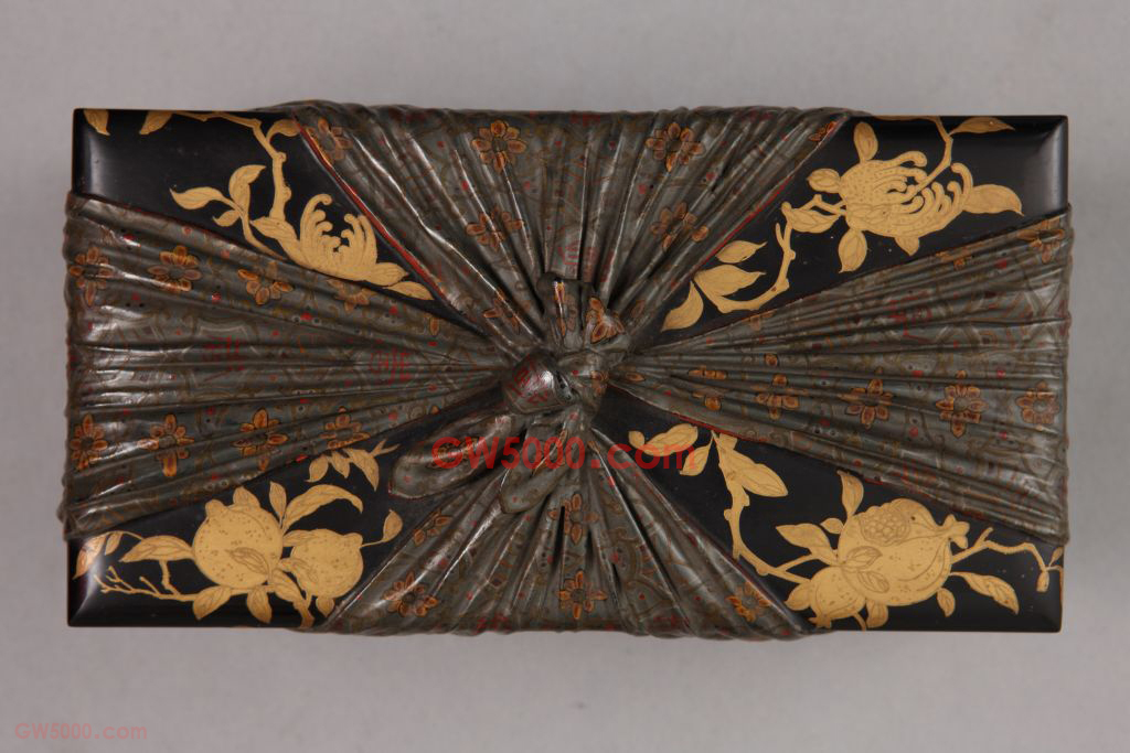 从稍远处观看,此件长方形盒似由在盒盖中央打结的锦袱包裹着,,走近则会发现,包袱皮其实系用漆灰堆起雕琢而成,表面髹银灰色漆,在菱形网格内用黄、红、黑等色漆装饰朵花、寿字及龟背锦纹。由于制作精巧细致,锦袱的皱褶效果惟妙惟肖,几可乱真。盒盖四角袒露之处采用黑漆描金技法装饰佛手、石榴、寿桃,俗称“三多”,分别寓意多福、多子、多寿。盖内及盒内洒金,盒底髹银灰色漆。构思巧妙,色彩艳而不俗,是这件作品的显著特点。查阅相关文献可以发现包袱式漆盒在雍正年间主要用于盛装眼镜和火镰(包)。
