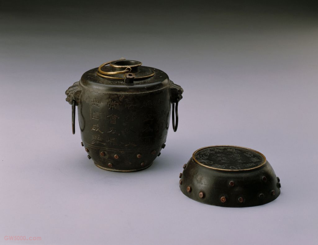 锡刻诗句鼓式温壶,清,高11.9厘米,口径7厘米,底径6.3厘米。 温壶整体造型为鼓形,由盖、外套、内壶三部分组成。盖、外套为铜质,内壶为锡质。盖立壁与外套下部近足处均饰有乳钉,风格质朴古拙。外套两侧有兽头衔环,壶嘴流短、出于肩部近口处有壶嘴。内壶有提梁。铜外套上刻有诗文: 未识酒中趣,空为酒所茕。 以文常会友,惟德自成邻。 温壶使用时,将热水注入外套内,再置入装好酒液的内壶。使用此法烫酒比用炭火直接加热更卫生清洁,且外套中的热水可随时更换,而使酒液得以持续保温。此壶做工考究,是一件难得的酒具。