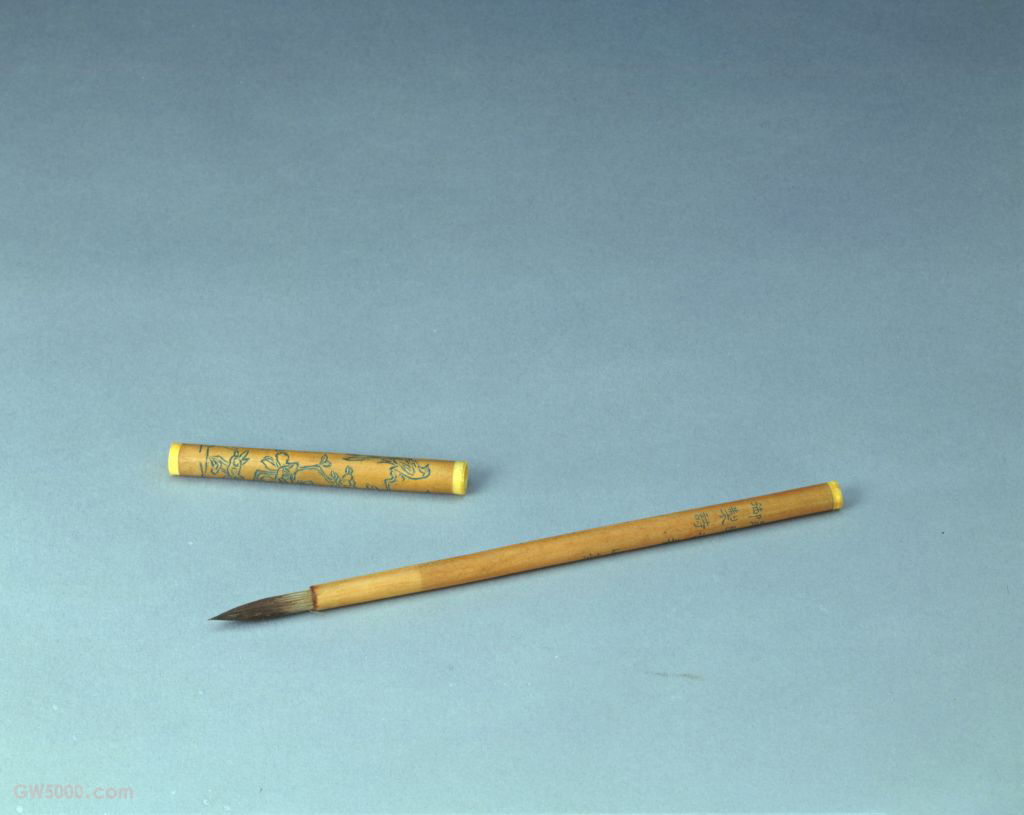 笔为紫檀木管,体轻且气味芳香。笔管刻御制山茶花诗句:“火色宁妨腊月寒,猩红高凡压回栏。滇中品有七十二,一一谁能取次看。”填蓝隶书。笔帽刻山茶花枝栖鸟,诗情画意尽显笔间。此为乾隆时期御制笔。