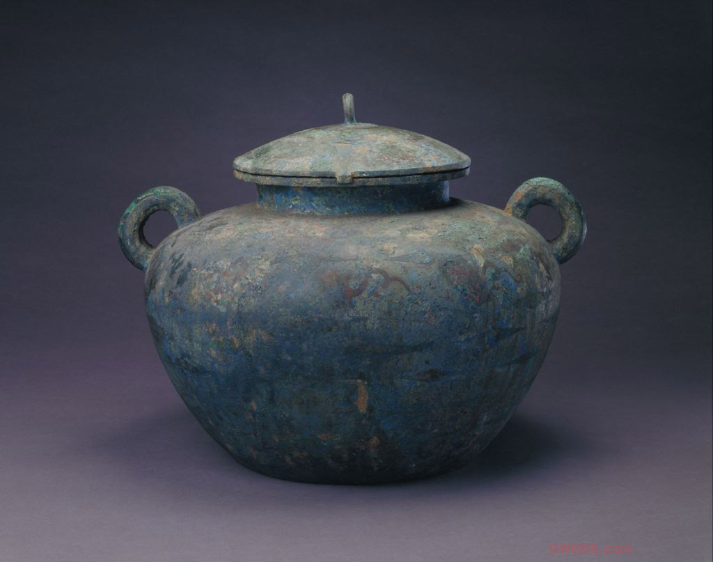 瓿圆体,小口,大腹,肩上有二环,有盖,盖顶部正中有一环。盖、器肩及腹下部饰菱纹,腹部饰龙纹。纹饰均以红铜镶嵌。一种金属镶嵌工艺。目前所知,早在商代就出现了于铜器上镶嵌红铜的技术,故宫博物院藏有一件嵌红铜的直内戈。西周时期,这种技术几乎被人们遗忘,春秋时,嵌红铜技法又重新恢复和流行起来。