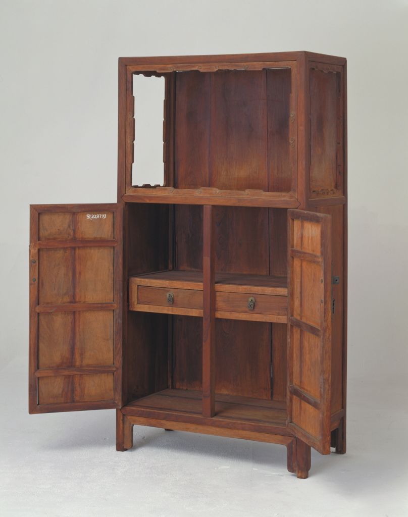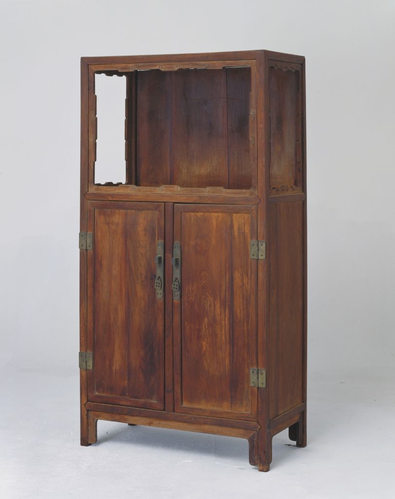 清早期,高200厘米,横106厘米,纵12厘米。 柜格黄花梨木质,上部之格三面开敞。下部之柜对开门,柜门为平素面。柜内中部有两抽屉,屉面中心配铜拉手。两腿间安直牙条,方腿直足。 此柜格造型质朴,几无雕饰,从而愈显现出黄花梨材质的自然之美。此柜格主要体现了明代家具的风格,但细部表明其已具有清代家具的一些特征。中国传统家具的一种。其下面为柜,上面由两根立柱、背板及顶盖相组合。明清时期制作高档家具的木料品种之一。又称老花梨,黄檀属木类。我国海南岛有此树种,又名“海南檀”,现为国家一级保护植物。 印身侧面无雕琢,平面施刻印款或无款。 很多家具在立木与横木的支架交角处多运用形式不同的牙子来装饰。这种牙子中长而直的称为牙条。