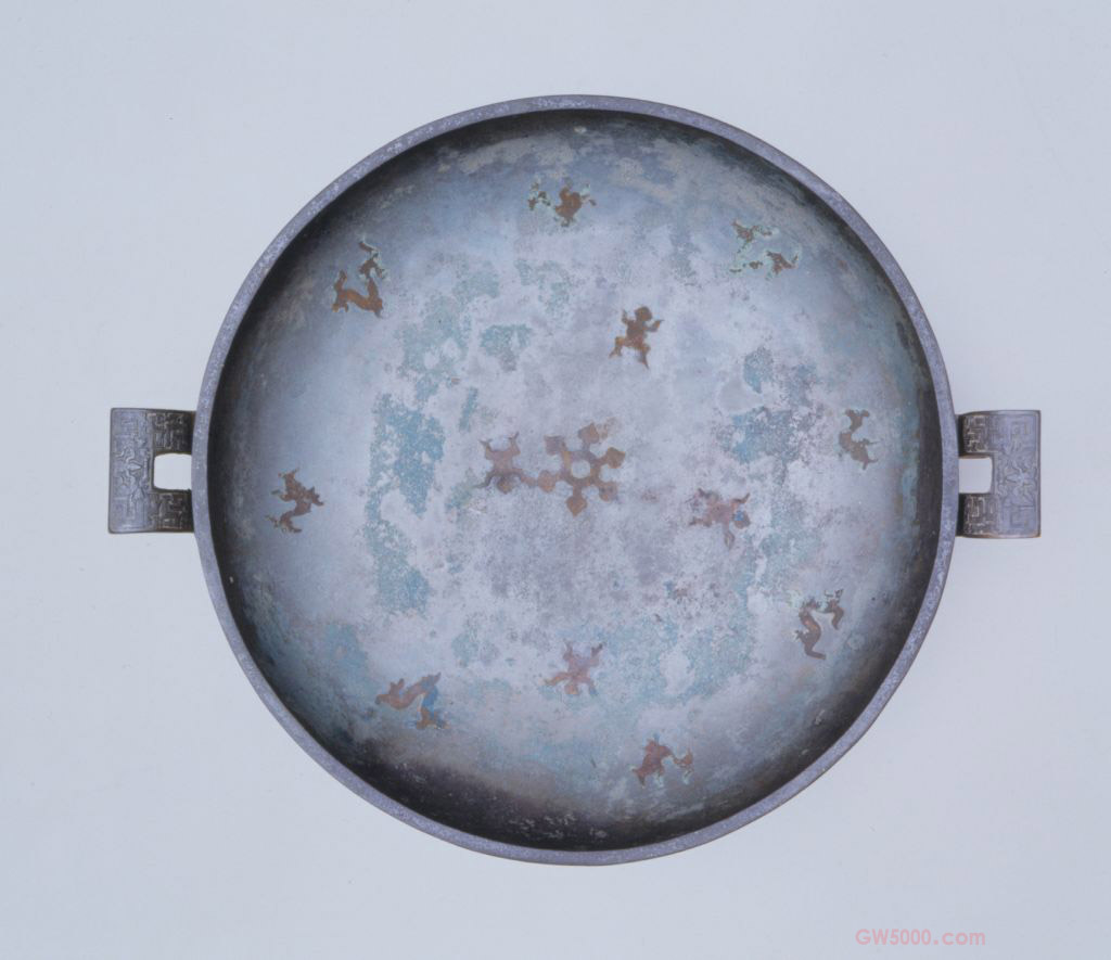 盘圆形,圈足,双附耳。盘口下饰蟠螭纹二周,足饰三角夔纹一周及云纹一周,双耳饰动物纹。盘内底正中饰一“六星”纹,周围饰四蛙,外有八兽形纹,均以红铜镶嵌。一种金属镶嵌工艺。目前所知,早在商代就出现了于铜器上镶嵌红铜的技术,故宫博物院藏有一件嵌红铜的直内戈。西周时期,这种技术几乎被人们遗忘,春秋时,嵌红铜技法又重新恢复和流行起来。
