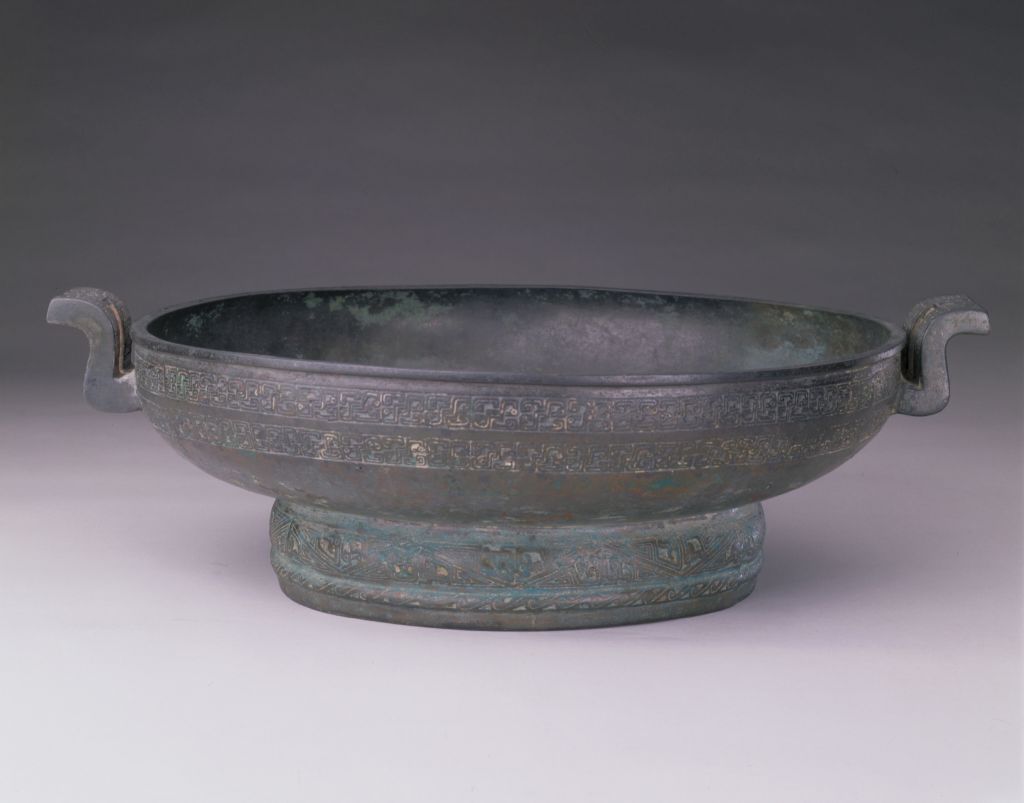 青铜器中的盘一般为承水器,多与匜、盉配合使用。其用法据《礼记·内则》载:“进盥,少者奉槃(盘),长者奉水,请沃盥,盥卒授巾。”沃盥,即洗手,以匜或盉浇水于手,盘则用来承接弃水,宴飨前后行之,也称“沃盥之礼”。此盘形体颇大,也可作盛水之用。青铜器中的盘最早出现于商代早期,战国时逐渐消失。