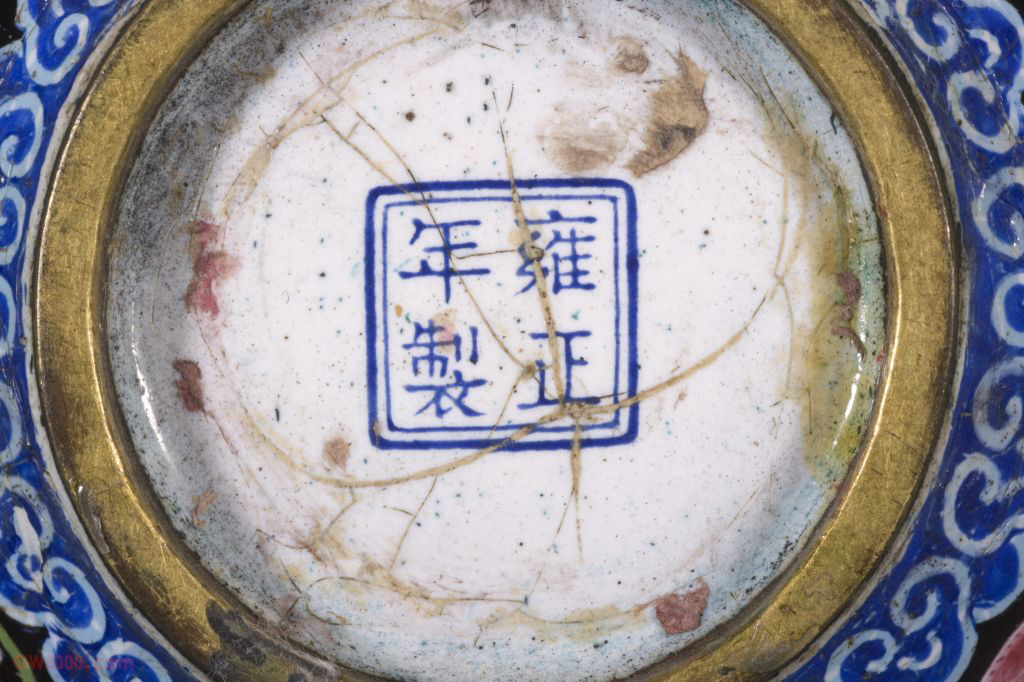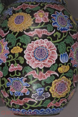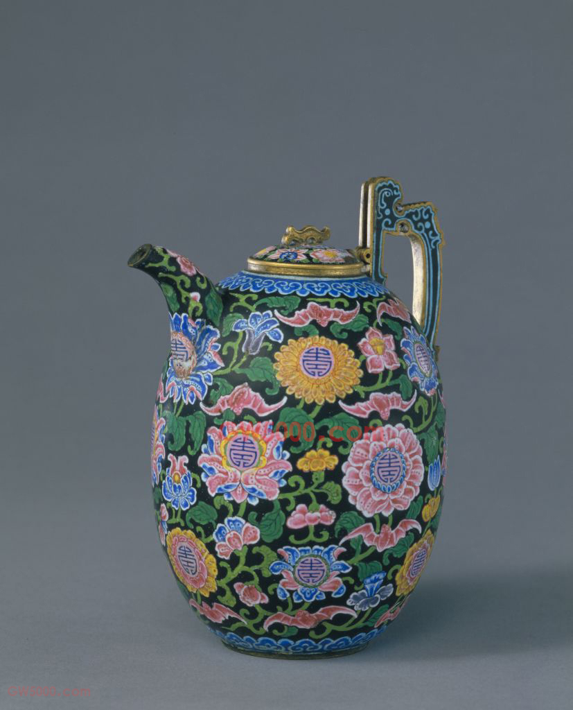 雍正款画珐琅寿字花卉纹卤壶,清雍正,高13厘米,口径3.1厘米,足径4.1厘米。清宫旧藏。 卤壶卵形,短流,螭形高柄,柄根与盖以转轴相连,可开合。通体以黑色珐琅为地,其上饰交错排列的缠枝花朵十八个,每朵花的花心为蓝色团寿字,花朵间有红色蝙蝠穿飞,整体图案寓意福寿吉祥。足底中心书蓝色“雍正年制”款。 该壶造型仿日本漆器,但装饰仍为我国传统图案,其中黑色珐琅的运用是雍正朝画珐琅工艺的用色特征,风格别具。金属胎珐琅工艺之一。作法是先在红铜胎上涂白珐琅,入窑烧结后,在其平滑的表面以各色珐琅料及金绘画图案,再经焙烧而成。这种工艺晚于錾胎和掐丝珐琅,是清康熙年间(1662—1722年)在欧洲画珐琅工艺的影响下烧制成功的。