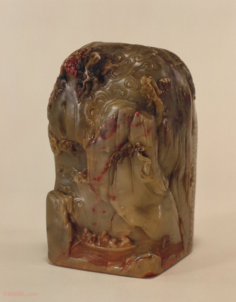 “惟精惟一”宝,清乾隆,昌化石质,随形雕苏轼《赤壁赋》文,汉文篆书。面6.9厘米见方,通高11.9厘米。贴黄签一,上墨书“惟精惟一御宝一方”。