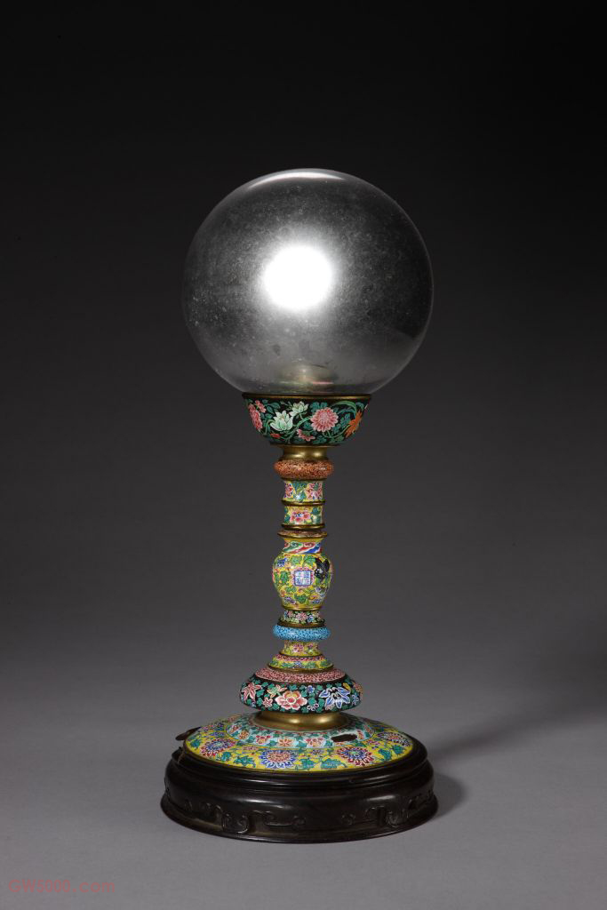 雍正款画珐琅天球式冠架,清雍正,通高38.7厘米,球径14.2厘米,座底径16.7厘米。清宫旧藏。 冠架由冠伞、梃柱、底座三部分组成。球形冠伞为水银玻璃质。梃柱由多层环状器相叠,中间为宝瓶形状。底为覆盘式座,下附紫檀木座。柱与座分别以黄、黑、白、蓝等色珐琅为地,绘饰彩色的缠枝花卉纹。宝瓶腹部蓝色方框内,书“雍正年制”款。 冠架,用以放置冠帽的器具,为宫廷日常生活用器,有玉、漆、木、瓷等多种材质。该冠架形制是雍正年间所创。根据档案记载,雍正朝曾数次下令制造“玻璃轩辕镜帽架”,并流传至今,此为其一。金属胎珐琅工艺之一。作法是先在红铜胎上涂白珐琅,入窑烧结后,在其平滑的表面以各色珐琅料及金绘画图案,再经焙烧而成。这种工艺晚于錾胎和掐丝珐琅,是清康熙年间(1662—1722年)在欧洲画珐琅工艺的影响下烧制成功的。 中国传统装饰花纹之一。所绘花朵系以植物的枝干或蔓藤作骨架,枝叶相互缠绕,构成四方连续或二方连续的图案,统一中寓变化。有缠枝莲、缠枝菊、缠枝牡丹和缠枝宝相花等多种纹样。 景德镇窑生产的明清瓷器上经常采用的一种图案。常见于青花、彩瓷上,是把单独的花朵以勾线连结起来,构成具有多变的形式活泼或具图案效果的纹饰。