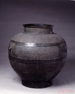 羽纹四耳缶,高40厘米,口径21.6厘米,腹径42.3厘米。