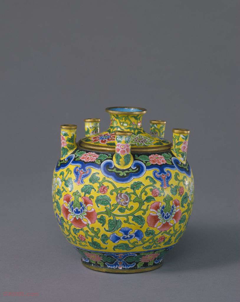 六颈瓶图案描绘工致,花卉排列整齐,釉料细腻,整体做工考究精良。在造型上新颖别致,是清雍正时期画珐琅器中的新器形。金属胎珐琅工艺之一。作法是先在红铜胎上涂白珐琅,入窑烧结后,在其平滑的表面以各色珐琅料及金绘画图案,再经焙烧而成。这种工艺晚于錾胎和掐丝珐琅,是清康熙年间(1662—1722年)在欧洲画珐琅工艺的影响下烧制成功的。