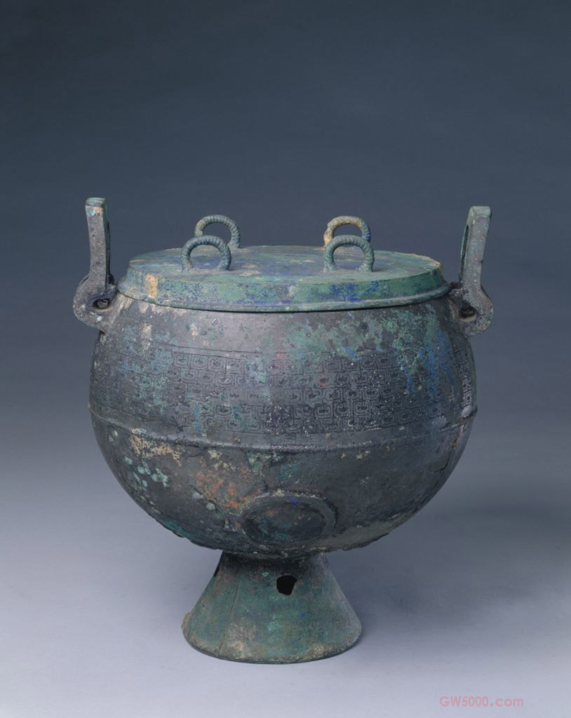 豆圆体,双附耳,矮圈足,平盖,上铸有四环。盖面及腹部各饰蟠螭纹一周,耳上饰回纹,腹下部有三处突起痕迹,足有四穿孔。蟠螭,即盘曲的龙,躯体较为粗壮。《文选》:“白鹿孑蜺于欂栌,蟠螭宛转而承楣。”