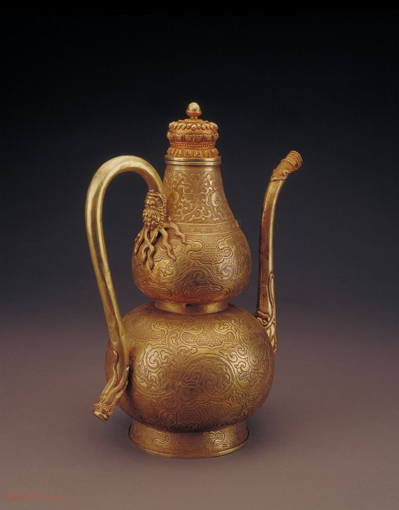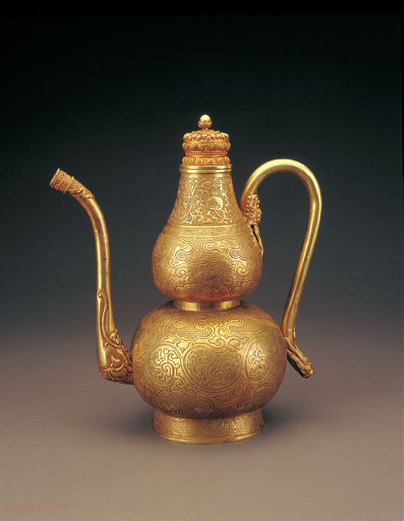 金錾缠枝莲纹执壶,清,高30.8厘米,宽27厘米。 执壶为五成金质,直口,直颈,壶身呈葫芦形,象首流,龙首柄,高圈足,有双层莲瓣纹盖。通体錾刻缠枝莲花纹。 此执壶造型优雅,线条流畅活泼,錾刻的纹饰极其精细繁复,金色的质地与精美的纹饰相得益彰。此种执壶即可陈设也可使用。我国古代金工传统工艺之一。用小锤敲击各种大小不同的金属錾子,在金属表面留下錾痕,形成各种不同的纹理,使单一的金属表面产生多层次的立体装饰效果。此种工艺始于春秋晚期,盛行于战国,至今依然为匠师们沿用。 一种酒器。最早为瓷质的,出现于中唐时,当时称注子。唐代执壶硕腹,喇叭口,短嘴,壶的重心在下部。后壶体渐瘦长,重心向上提,五代至宋时壶体多为瓜棱式,往往与注碗成套使用。从元代开始,执壶的壶体呈玉壶春瓶式,壶流弯曲而细长,景德镇窑与龙泉窑都有烧制。明清时期,形式变化不大,并开始出现玉、珐琅、金银等质地的执壶。 莲花俗称“佛花”,莲瓣纹是佛教文化影响下流行的纹饰。南北朝时期由于佛教文化盛行,瓷器上常用莲瓣纹做装饰。隋初瓷器装饰也受此风影响。金属工艺的一种。即用工具剔除地纹,使纹饰轮廓线凸起。錾金工艺技法早在商代就已出现,到清代,被广泛地运用于各种金属工艺品上。中国传统装饰花纹之一。所绘花朵系以植物的枝干或蔓藤作骨架,枝叶相互缠绕,构成四方连续或二方连续的图案,统一中寓变化。有缠枝莲、缠枝菊、缠枝牡丹和缠枝宝相花等多种纹样。 莲花作为佛教的标志之一,象征纯洁,缠枝因枝蔓连绵不断,具生生不息之意。缠枝莲花纹是寓意吉祥的传统装饰纹样。 中国传统装饰花纹形式之一。其绘花朵上下周转,枝叶相互缠绕成图案形式,有缠枝莲、缠枝菊、缠枝牡丹等。以莲花为主题者,称缠枝莲。莲花是随佛教的传入而在中国的工艺品上流行开的。魏晋南北朝时佛教艺术在中国大为盛行,莲花便作为佛的象征而广泛出现在中国的工艺品上。南北朝时瓷器上的莲花瓣装饰十分普遍,成为这一时期瓷器装饰的标志性的纹样。此后,莲花就成为瓷器装饰中最普遍的纹样之一。