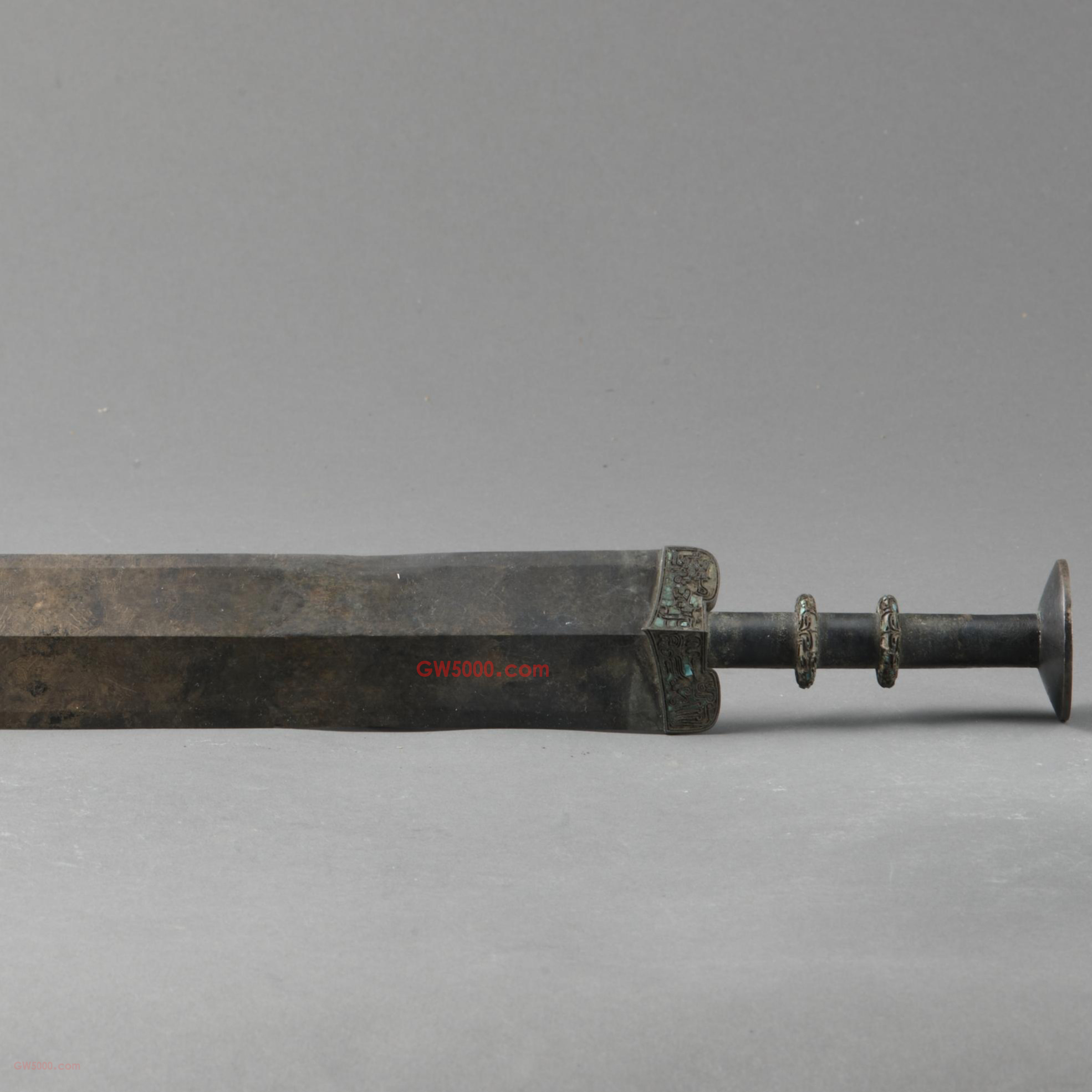 上海博物馆剑体窄长,至四分之三后从部内收弧曲,出脊、尖锋,厚格呈凹字形, 圆茎上有两箍,剑首呈同心圆。