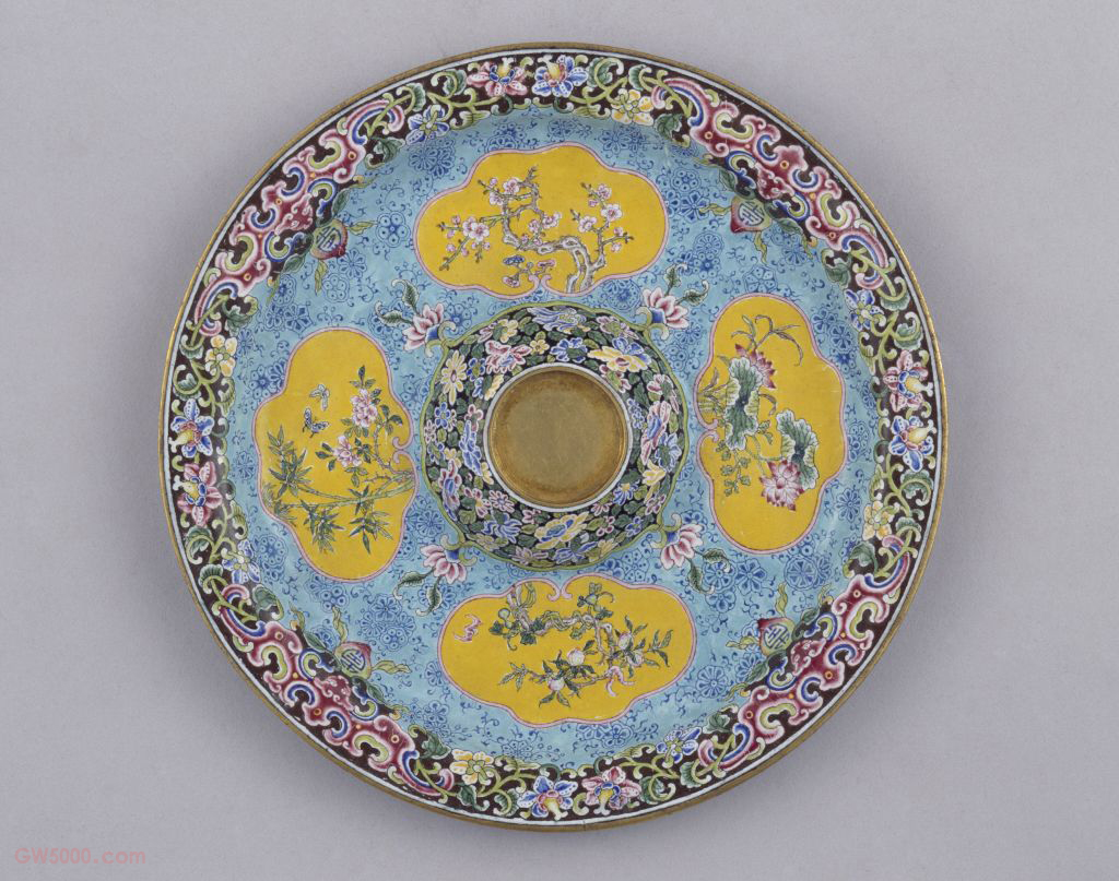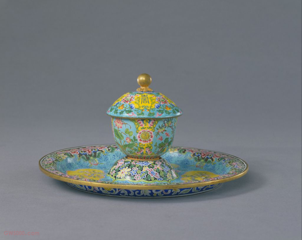 雍正款画珐琅寿字花卉纹盏,清雍正,通高8.5厘米,口径5.1厘米,足径2.5厘米,托盘口径16厘米,足径12厘米。清宫旧藏。 盏为圆形,直口带盖,圈足。下置托盘,盘中心凸起盏槽,与盏的圈足相吻合。盏上绘制了莲花、月季、翠竹、梅花、桃实、石榴、灵芝、佛手、葫芦以及蝙蝠等,寓意多福多寿、子孙万代。足内白地,双方框内蓝色楷书“雍正年制”款。托盘饰寿字、花卉、桃蝠纹,同样寓意吉祥。底蓝地黑色楷书“雍正年制”款。 盏及托通体在地色的设计上,分别使用了浅蓝、黄色和黑色,设色清晰鲜明,对比强烈,图案花纹用笔细腻,制作工艺极为考究。金属胎珐琅工艺之一。作法是先在红铜胎上涂白珐琅,入窑烧结后,在其平滑的表面以各色珐琅料及金绘画图案,再经焙烧而成。这种工艺晚于錾胎和掐丝珐琅,是清康熙年间(1662—1722年)在欧洲画珐琅工艺的影响下烧制成功的。 珐琅,又称“佛郎”“法蓝”“琺瑯”,是一外来语的音译词。珐琅的基本成分为石英、长石、硼砂和氟化物,与陶瓷釉、琉璃、玻璃(料)同属硅酸盐类物质。中国古代习惯将附着在陶或瓷胎表面的称“釉”;附着在建筑瓦件上的称“琉璃”;而附着在金属表面上的则称为“珐琅”。 金属胎珐琅器则依据在制作过程中具体加工工艺的不同,可分为掐丝珐琅器、錾胎珐琅器、画珐琅器和透明珐琅器等几个品种。放置茶盏的承托物,是与盏配套使用的一种茶具,在宋代较为流行。瓷质盏托始见于东晋,宋代汝窑、定窑、钧窑、景德镇窑等窑均有烧制。托口沿除圆形还有花瓣形。 我国传统装饰技法之一。即为使器物上的装饰变化多样或突出某一形象,往往在器物的某一部位勾勒出某一形状(如扇形、蕉叶形、菱形、心形、桃形、圆形等)的空间,其内饰以图纹。