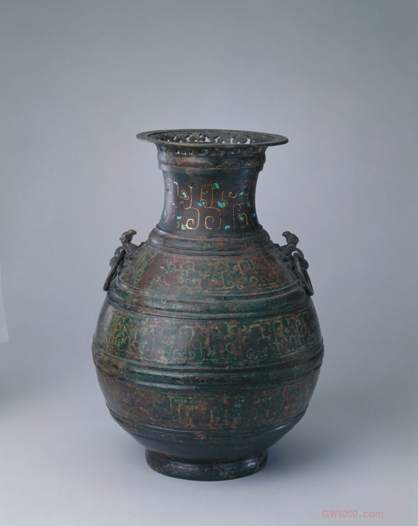 错金银鸟耳壶,战国前期,高36.9厘米,口径17.4厘米,腹径26.1厘米,足径13.9厘米,重5880g。