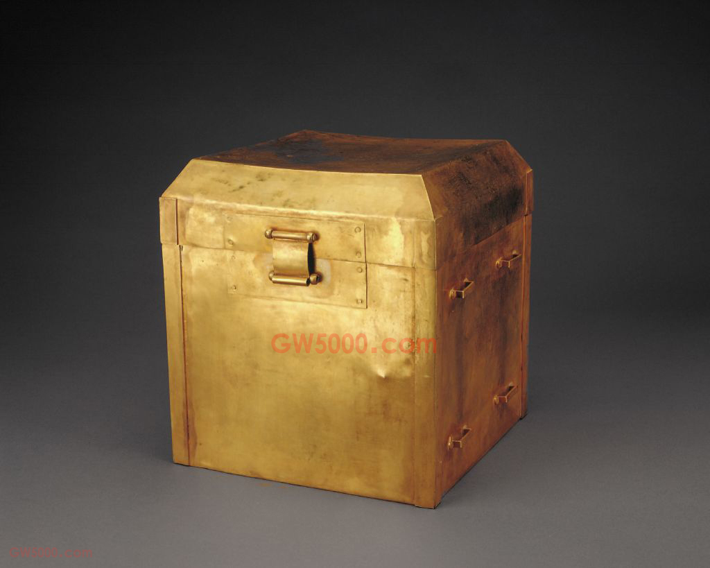八成金印匣,清,匣高27.6厘米,腹径24.5厘米,池高9.7厘米,径20.3厘米。 印匣内置印池,合为一套,均为八成金质,成色尚好。匣体呈方形,盖面呈拱起的梯形。印池边沿外折,置于印匣之中,为存放印玺之用。印匣正面有扣别以供开合,两侧各备有四个提手,可系绳。 清代帝后的印玺皆备有印匣、印池作为存放印玺之用。印匣外再套用贵重木质印玺盒成为一套印玺存放用具。由数件大小不等的单独印章相套合而成的组印,又有人称之为子母印,一般有2到4件不等。套印出现于东汉后期,常见于魏晋时期,均为铜质。汉末的套印形体较小,印钮为龟钮或瓦钮。大印印台中空,侧面开口,小印嵌入,两件相套合。魏晋时期的套印形体较大,印钮为避邪钮,有多至四印相套者,但最内的小印往往是扁小的双面印。套印的出现与印凭的使用对象有关,外层印面均是印主人的姓名,内中小印之印文则是其字号。套印的使用表明印章的功用划分更为细致。