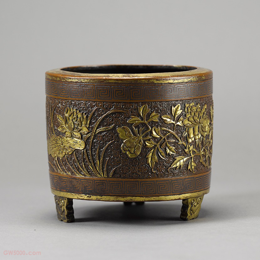 上海博物馆腹壁以六角形花卉纹穿插卐字纹形成华丽繁复的底层,其上浮雕水仙、菊花、荷花、牡丹等四时花卉,象征花团锦簇的美好寓意。口沿、底圈、三足与四时花卉皆有鎏金,利用色彩明暗对比来增加炉体图像的立体感,使得此炉呈现一种有别于宣德炉追求光素朴实的崭新风格。