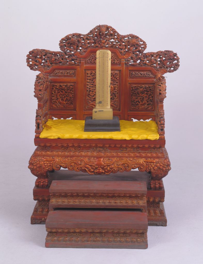 清早期,高165厘米,长109厘米,宽60厘米。 宝座通体髹金漆,五屏式座围,靠背三扇,左右扶手各一扇,五扇的高度从背部中央到两侧扶手依次递减。靠背及扶手上的屏帽均透雕龙纹,靠背搭脑中间高两侧低,两端作出垂云纹翘头。三扇背屏上安有横枨,分三段嵌装绦环板,上段及中段雕饰云纹和龙纹,下段锼出壸门亮脚。座面嵌装硬板,座面下束腰上铲地浮雕结子花。束腰上下有莲纹托腮,洼堂肚牙子上满地浮雕睚眦纹,四条腿作鼓腿膨牙状,足端雕外翻的狮足,足下踩有厚硕的须弥底座,显得端庄稳重。 此供座为奉先殿所用之物,是清宫中供奉于神位前的宝座。传统家具中一种体型宽大的坐具,亦称“御座”。明以后,随着皇权制度的强化,宝座成为帝王御用坐具的代名词,象征着帝王的权威。《明史》载,明神宗时,宦官冯保窃权,“帝御殿,保辄侍侧”。当时的吏部都给事中雒遵进言:“保一侍从之仆,乃敢立天子宝座,文武群工拜天子耶,抑拜见中官耶?”将宦官立于宝座之侧视为亵渎皇权的大不敬行为。 宝座大多摆放在宫廷正殿明间的中心或显要位置,单独陈设,极少成对。在宝座的背后还要放置一个较大的座屏,两边放置甪端、香筒、仙鹤、蜡钎等器物,格外尊贵、庄严。皇帝端坐在宝座之上,俯视群臣,“君临天下”,充分体现出帝王的权威,以达到“明制度,示等威”的目的。家具上常用的金漆为《髹饰录》所谓的“罩金漆”,其工艺为在木胎漆地上贴饰金箔,上面再罩透明漆。亦称欹床。中国传统家具中的一种坐具,现已很少见。其形式犹如椅子的靠背,是一种无座腿甚至无座面的坐具。其背后安有可以撑放的活动支架,可根据使用者的要求调节靠背的角度。它多在床榻上或席地使用。明高濂《遵生八笺》中说:“靠背以杂木为框,中穿细藤,如镜架然。高可二尺,阔一尺八寸,下作机扃,以准高低,置之榻上,坐起靠背,偃仰适情,甚可人意。”宋、明绘画中也可见到此种坐具。装在屏风上端的雕花构件称为屏帽。 雕刻技法之一。一种是在浮雕的基础上镂空背景部分,有单面雕、双面雕之分。另一种介于圆雕和浮雕之间,常用于民间床、窗、梁、护板的雕刻中。 陶瓷器装饰纹样之一种。明、清两代是陶瓷器以龙纹为装饰的全盛时期,主要采用釉上、釉下彩绘方法,亦有印花、刻划等工艺。龙的体态有较多变化,常见有云龙、戏珠龙、海水龙、螭龙、行龙、立龙、正面龙、侧面龙、夔龙等。装在椅背或衣架之上用于连接立柱和背板的构件。椅背搭脑一般正中稍高并略向后卷,以便人们休息时将头搭靠其上,故名。家具腿间用于连接两腿的横向构件。在家具的板心或其它构件上浮雕或彩绘方形或圆形的绦线,称为绦环。传统家具上的一种构件,常用于柜门的板心,屏风的上眉板、腰板和下裙板上。其作法是沿边框里侧于板心浮雕一周突起的棱线,并保持与边框平行。突起的线纹由于四角相连成方环状,犹如衣服上的绦边,故曰“绦环板”。宫内小巷道称壸(音捆),此处为家具术语之一。通常在横牙正中开一尖口,再向两侧曲线延伸与竖向牙条相交,此种作法称为劵口;如果牙条四面相交,则每面正中均开尖口,此种作法称为圈口;如果只有一面横牙条作出壸门装饰,则称为壸门牙子。常指攒框式椅背的下牙,牙板下缘锼出各式镂空曲边,俗称“亮脚”。家具中床面或凳面之板心用木板镶成或席面下衬木板均称硬板。束腰,明清家具部件名称。原是须弥座上枭与下枭之间的部分,在家具上指面框和牙条之间缩进的部。束腰是我国传统家具造型的典型式样之一。在平面上雕出凸起的纹饰或物象的一种雕塑。按凸起高度的不同,可分为高浮雕、深浮雕、浅浮雕等,也有几种雕刻技法结合使用的形式,多见于高精繁杂的雕刻作品。 束腰与牙条之间的托层。有些束腰家具,束腰与牙条不衔接或衔接甚少,不能起到支撑作用,这时在两者之间加一木条过渡,使结构更加合理。清式家具的装饰手法之一,牙条正中下垂的曲边装饰线角称为“洼堂肚”。一般指设置在桌案的面框或束腰下、连接于两腿之间的部件。设于其它部位的则常称牙条。带束腰家具中常见的一种装饰手法。四腿自束腰下向外鼓出,然后又向内兜转,形成内翻马蹄状,牙板亦随腿的弧度向外膨出。 一种题写神祇名称的带有底座的木制牌。