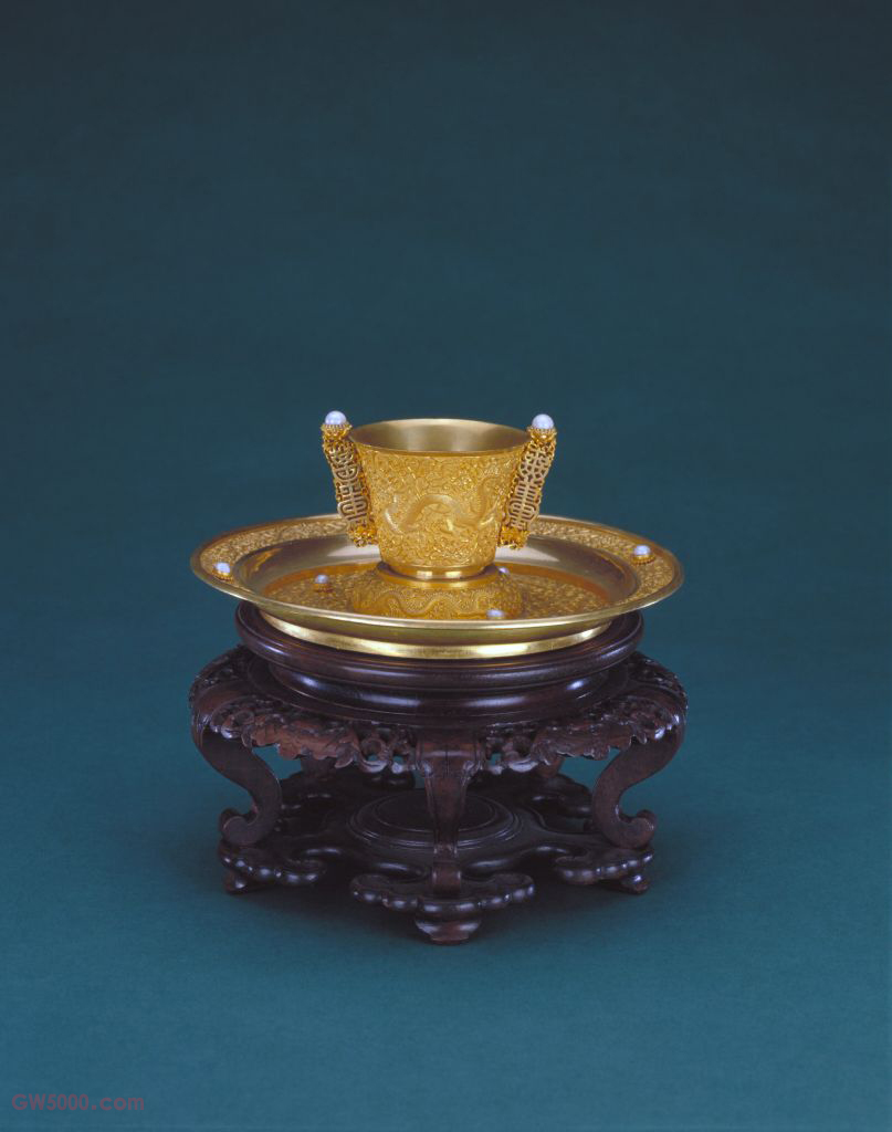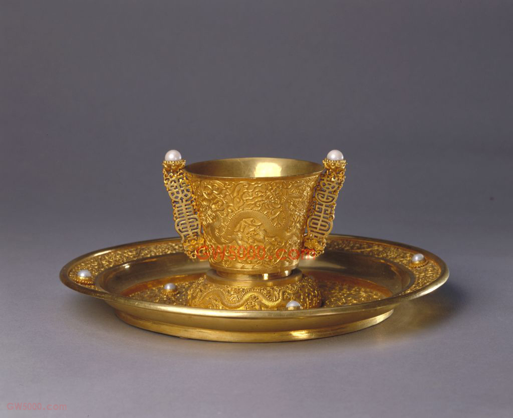 金嵌珠“万寿无疆”杯盘,清,通高7.3厘米,杯口径7.1厘米,盘高2.2厘米,盘径18厘米。 金杯为圆形,敞口,圈足。内壁光素,外壁錾刻双龙,间饰宝相花,近底处有海水纹一周。杯两侧分别镂空透錾篆书“万寿”、“无疆”为耳,双耳顶端均饰莲花托,上嵌东珠。金盘亦为圆形,折沿上錾宝相花一周,等距嵌饰东珠4颗。盘内錾朵云纹、莲花纹,嵌珍珠4颗。盘心起杯托,其上錾刻云龙纹。 此杯盘金质上乘,造型端庄,装饰华丽,工艺极其精湛,应是清代中期皇帝寿辰时所使用的酒具。金属工艺的一种。即用工具剔除地纹,使纹饰轮廓线凸起。錾金工艺技法早在商代就已出现,到清代,被广泛地运用于各种金属工艺品上。 我国传统装饰纹样之一, 又称“宝仙花”、“宝花花”。一般以某种花卉(如牡丹、莲花)为主体,中间镶嵌形状不同、大小粗细有别的其它花叶,尤其在花芯和花瓣基部,用圆珠作规则排列,似闪闪发光的宝珠,富丽华美,故名宝相花。盛行于隋唐时期,元明清时期的器物上亦多以之为装饰题材。 镂空是瓷器的装饰技法之一,也被称作“镂花”或“透雕”。它是将器物胎体上的纹样镂通,形成内外通透的图案。 清朝的冠服制度中特别讲究用东珠。东珠是珍珠的一种,古人依产地的不同把珍珠划分为南北两大系,而清朝则把产生于东北地区的北珠称为“东珠”。东珠是湖珠,色白而透明度较差,但因它产量极少,所以成为贵重之物。清朝的冠服制度只有皇帝、皇太后、皇后佩戴东珠朝珠,帽顶等所嵌东珠的数量也按亲王,郡王,贝勒等级有严格的限制。 陶瓷器装饰纹样之一种。明、清两代是陶瓷器以龙纹为装饰的全盛时期,主要采用釉上、釉下彩绘方法,亦有印花、刻划等工艺。龙的体态有较多变化,常见有云龙、戏珠龙、海水龙、螭龙、行龙、立龙、正面龙、侧面龙、夔龙等。