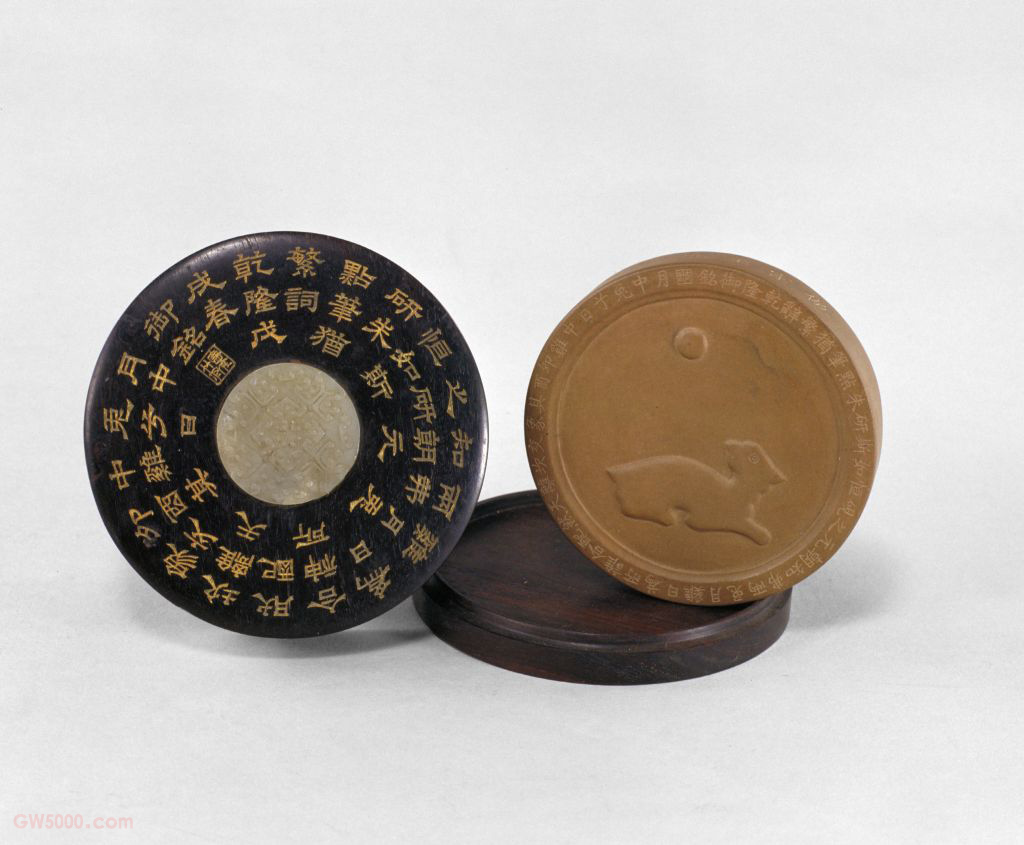澄泥仿宋玉兔朝元砚,清乾隆,高1.8厘米,直径10.4厘米。 砚圆形,砚面无砚池,雕有玉兔朝元图。此砚属于仿古澄泥套砚(六方)之一,原藏于清宫造办处。 砚缘周围有阴文楷书乾隆御题诗一首,“月中兔兮日中鸡,卯酉其象交坎离。天然配合谁所为,日鸡月兔两弗知。朝元之砚恒如斯,研朱点笔犹繁词。”又署“太仆”印一。侧面有阴文楷书“仿宋玉兔朝元砚”。砚台外附紫檀木嵌玉盒,盒面中间为圆形夔纹白玉一枚,周围有阴文填金隶书御制诗一首,文字与砚面题诗基本相同,只是“天然配合谁所为”一句中的“谁”改为“神”,又署“乾隆戊戌(1778年,乾隆四十三年)春御铭”,并“德充符”印一。 《乐府诗集》三四《相和歌辞·董逃行》云:“采取神药若木端,白哆长跪捣虾蟆丸。”晋傅云《拟天问》(《太平御览》卷四引)云:“月中何有?白兔捣药。”傅云《歌词》(《初学记》卷二九引)云:“兔捣药月间安足道!……。”故世以玉兔为月之代词。 砚面贮墨汁处,或称墨池,多为深凹小池。砚池多有富于装饰性者,以安排之巧、形状之奇或纹饰雕刻取胜。篆刻的一种方式,即把印文镌成凹状,在纸上钤盖时印文是白色,因而又称为白文。 紫檀木是世界上最名贵的木材之一,主要产于南北回归线之间的热带、亚热带地区,我国广东、云南等地有少量出产。其木质坚硬,体重,入水即沉,没有疤痕,呈紫黑色。紫檀木生长缓慢,非数百年不能成材,故极珍贵。紫檀木的纹理纤细浮动,变化无穷,其色调深沉,显得稳重、大方、美观。《博物要览》称:“新者色红,旧者色紫,有蟹爪纹,新者以水浸之,可染物。”我国古代使用紫檀木制作器物历史悠久,东汉末年已见于记载,唐代宫廷中亦有使用紫檀木的记载。至明代,紫檀木更是受到皇家的宠爱。清代,紫檀木大量进入宫廷中,为内务府造办处用于制作清宫家具及文玩之器的必备材料,同时一些富商大贾之家也多使用名贵的紫檀木制造家具及生活用品。 我国传统的装饰纹样之一。夔,神话中形似龙的兽名。《庄子·秋水》中言:“夔怜蚿,蚿怜风。”释文:“夔,一足兽也。……其状如牛,苍色无角,一足能走,出入水即风雨,目光如日月,其音如雷,名曰夔。”