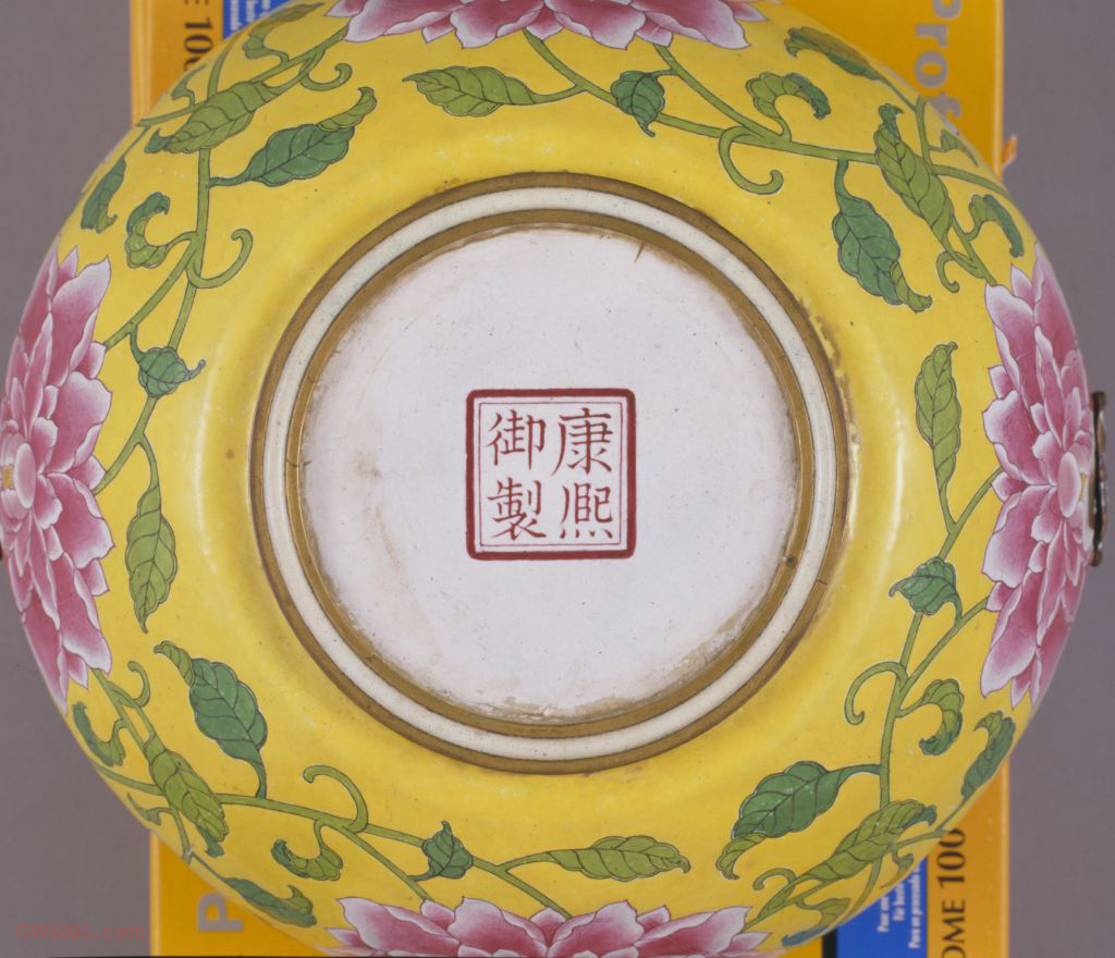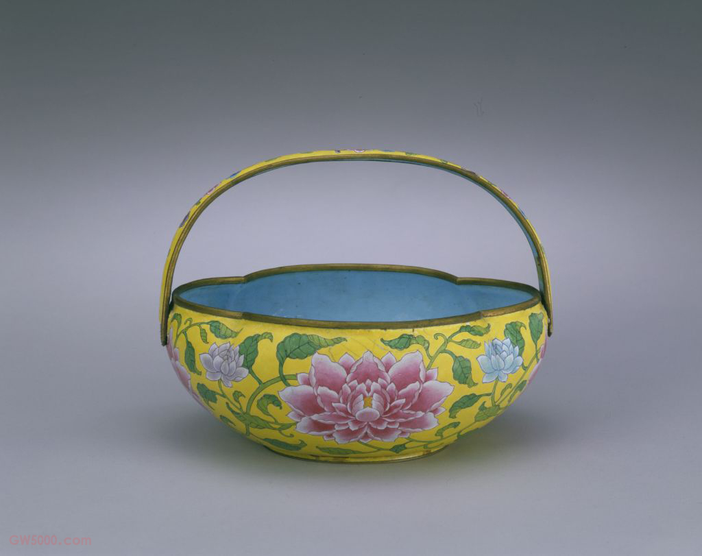 康熙款画珐琅牡丹花纹海棠式花篮,清康熙,通高13.5厘米,口径16.5—17厘米。 花篮为四瓣海棠式,上有提梁,矮圈足。外施黄色珐琅釉为地,上绘盛开的粉红色大朵牡丹花,间饰蓝、藕荷色微绽的小荷花,寓意“祥和富贵”。篮内施天蓝色釉。提梁绘折枝花卉。底白釉,署紫红釉“康熙御制”楷书款。 此器造型规整,釉色温润,色彩明快。通体施黄色地是康熙画珐琅器成熟时期的用色特征。当时宫廷珐琅作的匠师主要来自广州和欧洲,他们共同努力,烧制出了高水平的器物,此为代表作之一。金属胎珐琅工艺之一。作法是先在红铜胎上涂白珐琅,入窑烧结后,在其平滑的表面以各色珐琅料及金绘画图案,再经焙烧而成。这种工艺晚于錾胎和掐丝珐琅,是清康熙年间(1662—1722年)在欧洲画珐琅工艺的影响下烧制成功的。 珐琅,又称“佛郎”“法蓝”“琺瑯”,是一外来语的音译词。珐琅的基本成分为石英、长石、硼砂和氟化物,与陶瓷釉、琉璃、玻璃(料)同属硅酸盐类物质。中国古代习惯将附着在陶或瓷胎表面的称“釉”;附着在建筑瓦件上的称“琉璃”;而附着在金属表面上的则称为“珐琅”。 金属胎珐琅器则依据在制作过程中具体加工工艺的不同,可分为掐丝珐琅器、錾胎珐琅器、画珐琅器和透明珐琅器等几个品种。落叶小乔木,叶子呈椭圆形,花白色或淡粉红色。果实亦称海棠,球形,味酸甜。 花卉画的一种。画花卉不写全株,只画从树干上折下来的部分花枝,故名。有折枝梅、折枝莲、折枝牡丹、折枝果实等。 古建筑彩画绘画的一种题材。清代中期之前多画绿叶子花卉,清代晚期画黑叶子花卉。颜色釉品种之一。其以铜为呈色剂,经还原焰高温一次烧成。红釉于北宋初年已出现,但呈色不太稳定。真正纯正、釉色稳定的红釉是景德镇窑在明初创烧的鲜红釉。嘉靖年间又创烧以铁为呈色剂的矾红釉。 铜红釉为高温釉,铁红釉为低温釉。高温红釉种类很多,按色泽分别称宝石红、霁红、豇豆红、郎窑红。如按其发展状况,则永乐鲜红、宣德宝石红、嘉靖矾红、康熙的郎窑红和豇豆红较为著名。 低温黄釉瓷器创烧于明洪武时的景德镇官窑,以后各朝多有烧造。以“黄”与“皇”谐音,故以黄色象征皇家的尊贵,黄色瓷器亦只限于御用。黄釉瓷器均采用两次烧成,即先高温烧成涩胎或素白瓷,然后施黄釉,再入窑经850-900℃烘烧而成。由于黄釉瓷器常以浇釉法施釉,故有“浇黄”之称。对于颜色娇嫩如鸡油者,人们又称之为“娇黄”或“鸡油黄”。统观历史上的黄釉瓷器,以明弘治朝之产品最受称道,被视为黄釉瓷器的典范。其釉面光洁,釉色浅淡娇嫩。从故宫博物院收藏的诸多弘治黄釉瓷器来看,其呈色几无差异,表明当时黄釉瓷器烧造技术之娴熟。