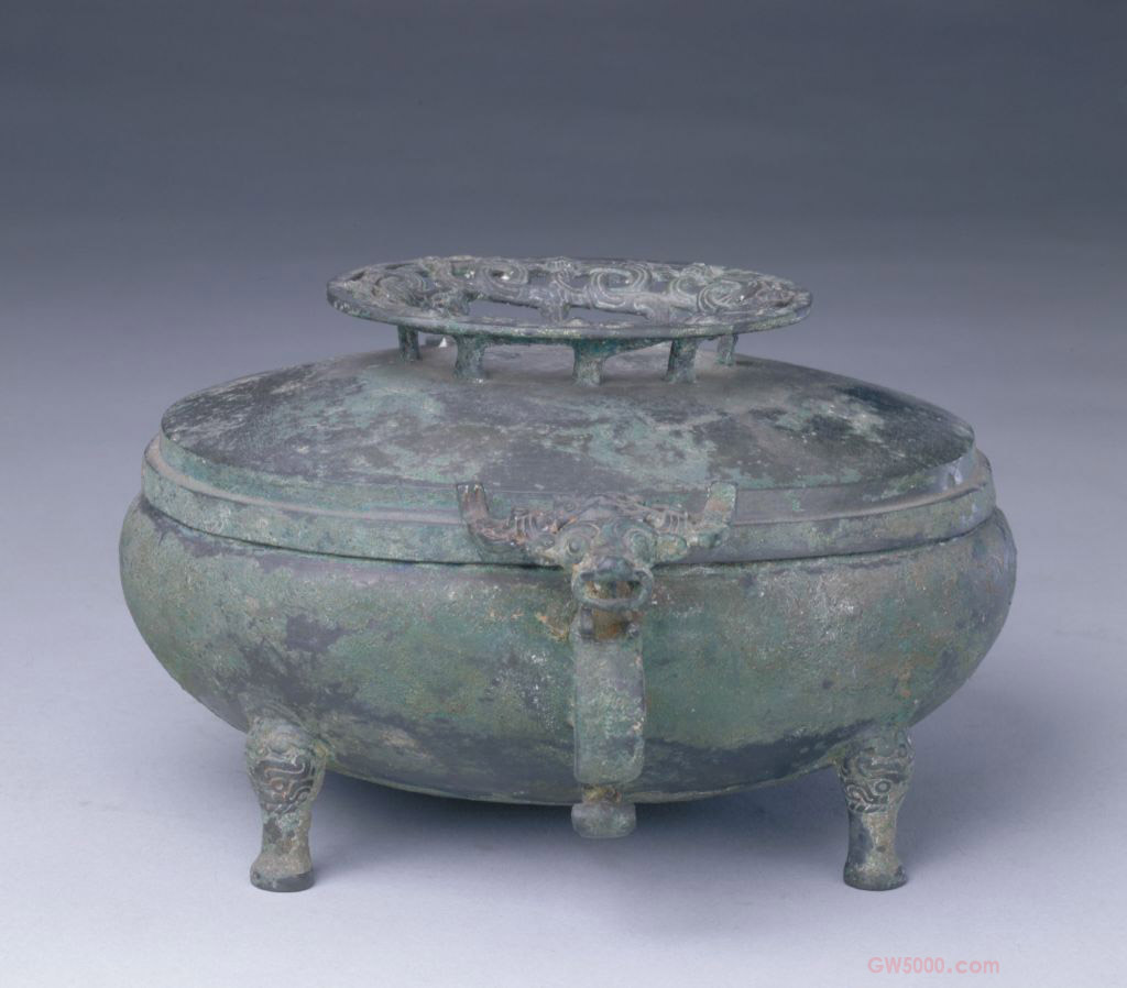 器有隆盖,盖顶捉手透空并饰蟠螭纹。椭圆形腹,腹两侧有龙形耳。器腹下侧附有四足,为人面、鸟嘴、双脚双翼的怪兽。饮酒器。此种形制的铜器,《西清古鉴》始称之为“舟”,后人多从之。近代考古发现这种器物自名为『0556』,从而为此类器物的准确定名提供了依据。『0556』的形制特点是敞口或敛口,腹的横截面与口部皆作椭圆形。腹较深,腹部两长边处多有双环耳,腹壁内收成平底,亦有下接矮圈足或接四足者。有的『0556』带盖。蟠螭,即盘曲的龙,躯体较为粗壮。《文选》:“白鹿孑蜺于欂栌,蟠螭宛转而承楣。”