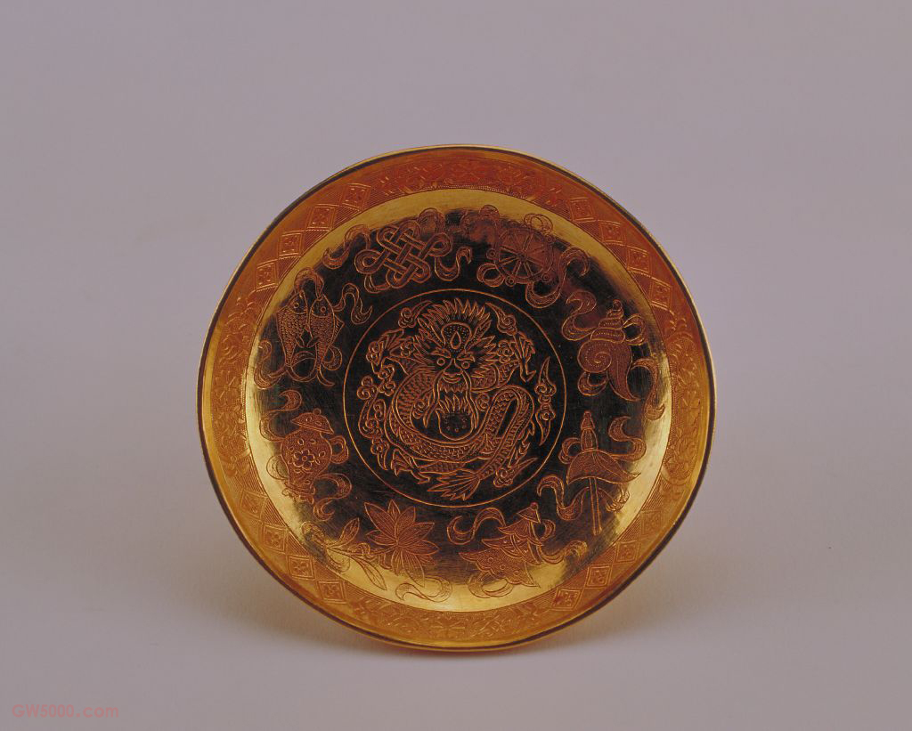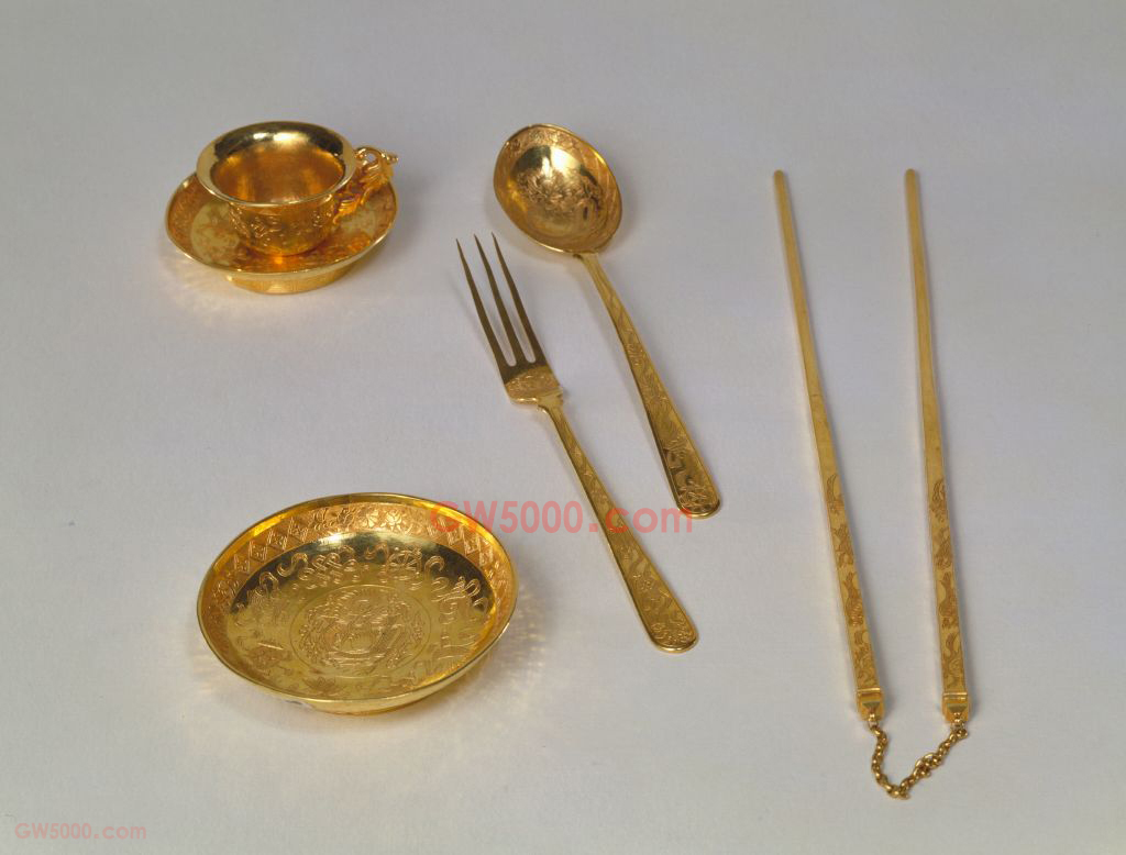 赤金錾花餐具,清,一套6件。碟高1.9厘米,口径7.9厘米;小碟高1.5厘米,口径6.5厘米;单耳杯高2.6厘米,口径4.4厘米;叉长16.9厘米,最宽3.5厘米;勺长16.7厘米,最宽3.5厘米;箸长24.2厘米,最宽0.5厘米,链长7.5厘米。 餐具由碟、小碟、单耳杯、叉、勺、箸组成。 碟为扁圆形,敞口,圈足。内心錾刻团龙纹,周围錾以八宝纹,近口沿处有小朵花纹及菱形花纹一周。足外墙有回纹,足底刻“北京”、“中原”、“足赤”等戳记。 小碟为圆形,敞口,圈足。内心凹下以承单耳杯,錾刻团龙纹,四周有八宝纹、小朵花纹及菱形花纹。足外墙刻回纹一周。此碟实为杯托,与单耳杯配成一套使用。 单耳杯为圆形,撇口,圈足。腹部外壁錾刻轮、螺、伞、盖、花、罐、鱼、肠八宝纹,近口沿处有小朵花纹和菱形纹。足外墙为回纹一周。杯一侧凸雕花叶形单耳。足底刻有“北京”、“中原”、“足赤”等戳记。此杯之足恰纳入上一件小碟的内心凹处,为一套。 叉有三齿,其柄部錾刻八宝纹饰中的花、罐、鱼、肠四种图案,中部錾刻一正面团龙纹。柄背面刻有“北京”、“中原”、“足赤”等戳记。 勺呈椭圆莲瓣形。勺内錾刻正面团龙纹,毛发乍起,身曲屈盘绕,两前爪高举于头部两侧,全身祥云围绕,周边为朵花纹及菱形花纹。柄部錾刻八宝纹中的轮、螺、伞、盖四种图案。柄背面有“北京”、“中原”、“足赤”等戳记。 箸为一双,上方下圆形,上半截方形的四面均錾刻八宝纹,顶端有环,两支有活环金链相连。中部均刻有“北京”、“中原”、“足赤”等戳记。 此6件餐具金质成色为足赤,色泽黄亮,熠熠生辉,錾刻细腻,纹饰清晰,工艺极精。 6件餐具共盛于红木匣中,内有一锦条,上书“北京廊坊头条”、“中原金珠店监制”。此为溥仪当年在天津盐业银行的抵押物,1951年回归故宫。 指颜色金黄而略呈赤色的黄金制品。黄金因稀有而珍贵,但更为珍贵之处在于它本身所具有的其他金属所无法比拟的特点。它具有良好的稳定性,在空气中不氧化;它熔点高,一千多度的高温仍可保其夺目光辉;它具有良好的延展性、抗腐蚀性,并具有美丽光亮的颜色。故人们将其保值作用看得很重。中国习惯在金饰品上标注“足金”、“赤金”、“足赤”、“千足金”等等。“足”即足金,也就是纯金。“赤”即赤金,指成色好。实际上,足金与赤金的含金量只有99.99%,即所谓“金无足赤”。我国古代金工传统工艺之一。用小锤敲击各种大小不同的金属錾子,在金属表面留下錾痕,形成各种不同的纹理,使单一的金属表面产生多层次的立体装饰效果。此种工艺始于春秋晚期,盛行于战国,至今依然为匠师们沿用。 又名羽觞、耳桮。羽觞之名,最早见于楚辞《招魂》:“瑶浆密酌,实羽觞些。”汉晋唐人的辞赋中都见羽觞之称,《汉书·外戚列传·下》有“酌羽觞兮消忧”之句。西汉称桮和耳桮,《史记·项羽本纪》“幸分我一桮羹”。马王堆一号汉墓出土的漆耳杯上有漆书“君幸酒”和“君幸食”等字样,故可肯定耳杯为古代盛酒、羹或其它食物的器具。耳杯最早少量出现于春秋晚期墓葬中,及至战国早期则大量出现。耳杯口一般均呈椭圆形,弧壁,平底,少数有假圈足。器内多髹红漆,外髹黑漆。根据耳部的不同形状,大体可分为方耳杯、圆耳杯两种类型,也有少量的高座耳杯。金属工艺的一种。即用工具剔除地纹,使纹饰轮廓线凸起。錾金工艺技法早在商代就已出现,到清代,被广泛地运用于各种金属工艺品上。一种身尾卷曲的龙形纹样。此纹饰仅见于西周早期的青铜器上,它存在的时间较短,是青铜器断代的重要依据。陶瓷器装饰纹样之一种。明、清两代是陶瓷器以龙纹为装饰的全盛时期,主要采用釉上、釉下彩绘方法,亦有印花、刻划等工艺。龙的体态有较多变化,常见有云龙、戏珠龙、海水龙、螭龙、行龙、立龙、正面龙、侧面龙、夔龙等。佛前供器,藏文称之为“八吉祥相”。由法轮、法螺、宝伞、白盖、莲花、宝罐、金鱼、盘肠八件组成。每件供器含义不同:轮代表佛说大法圆转,万劫不息;螺代表菩萨果妙音吉祥;伞代表张弛自如,曲覆众生;盖代表遍覆三千,净一切乐;花代表出五浊世无所染;罐代表福智圆满,具完无漏;鱼代表坚固活泼,能解坏劫;肠代表回环贯彻,一切通明。因为八宝寓意吉祥,所以成为我国传统工艺中的主要纹饰。 家具上常用的纹饰之一,由陶器和青铜器上的雷纹衍化而来,寓意吉利深长,苏州民间称之为“富贵不断头”。在家具上,回纹主要作为边饰,用于边框、牙条、足端或束腰等处。家具上大量采用回纹见于清代。即酸枝木,泛指豆科黄檀,属酸枝木类植物。有黑酸枝、红酸枝、白酸枝三种。