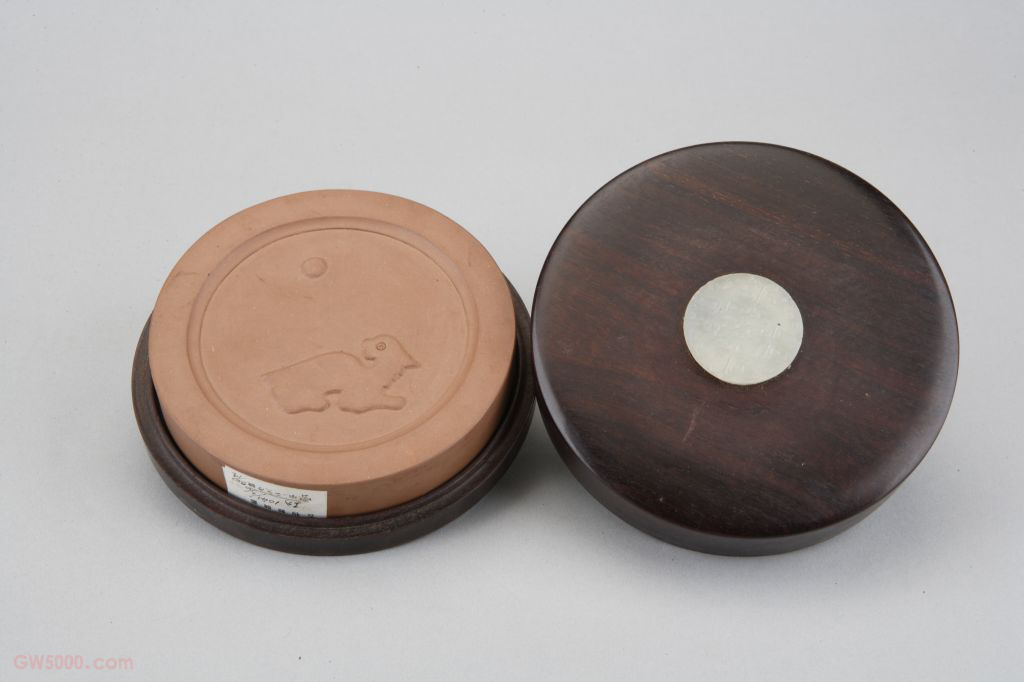 澄泥仿宋玉兔朝元砚,清乾隆,高2厘米,直径12.5厘米。 砚圆形,砚面无砚池,雕有玉兔朝元图。此砚属于仿古(乾隆时期澄泥砚的制作有添加宜兴澄泥)澄泥套砚(六方)之一,只是没有题刻御制诗句,侧面有阴文楷书“仿宋玉兔朝元砚”,盛装于嵌玉紫檀木盒中,砚盒素面。 乾隆时期仿古砚的制作最有新意。当年曾大量制作端石、歙石、宜兴澄泥等各式仿古套砚若干,特别是成套的仿古澄泥砚最为人称道。这些仿古澄泥套砚是当时宫廷最为重要的砚品形式,除御用之外也用来赏赐臣下。 《乐府诗集》三四《相和歌辞·董逃行》云:“采取神药若木端,白哆长跪捣虾蟆丸。”晋傅云《拟天问》(《太平御览》卷四引)云:“月中何有?白兔捣药。”傅云《歌词》(《初学记》卷二九引)云:“兔捣药月间安足道!……。”故世以玉兔为月之代词。 砚面贮墨汁处,或称墨池,多为深凹小池。砚池多有富于装饰性者,以安排之巧、形状之奇或纹饰雕刻取胜。即以过滤的细泥为材料制作而成的研墨器具,属陶砚一类。澄泥砚的制作起于唐而兴于宋。其制作方法借助于古代制作砖瓦陶器之工艺,将泥土经过澄滤,去粗渣沉淀以后加一些固剂,经制坯煅烧而成。澄泥砚质地坚硬耐磨,易于发墨,不损毫,不耗墨,堪与石砚相匹敌。一些古籍文献中还将澄泥砚、端砚、歙砚、洮河砚并称为我国四大名砚。我国虢州(今河南灵宝县南)、山西汾河沿岸的绛县、山东的柘沟镇、河北的滹沱河等地均产澄泥砚。 宜兴(1747—1809年),字桂圃,镶红旗人,清宗室爱新觉罗氏,恒新之子,永字辈。十一岁时授七品笔帖式,曾授太仆寺少卿、内府学士、镶黄旗蒙古副都统、经筵讲官、盛京礼部侍郎、盛京户部侍郎、盛京刑部侍郎、盛京仓场侍郎、山东巡抚、江苏巡抚、领队大臣、科布多参赞大臣、都察院左都御史、刑部尚书、步军统领、翻译会试考官等职,著有《清文补汇》、《庸言知旨》等要籍。篆刻的一种方式,即把印文镌成凹状,在纸上钤盖时印文是白色,因而又称为白文。 紫檀木是世界上最名贵的木材之一,主要产于南北回归线之间的热带、亚热带地区,我国广东、云南等地有少量出产。其木质坚硬,体重,入水即沉,没有疤痕,呈紫黑色。紫檀木生长缓慢,非数百年不能成材,故极珍贵。紫檀木的纹理纤细浮动,变化无穷,其色调深沉,显得稳重、大方、美观。《博物要览》称:“新者色红,旧者色紫,有蟹爪纹,新者以水浸之,可染物。”我国古代使用紫檀木制作器物历史悠久,东汉末年已见于记载,唐代宫廷中亦有使用紫檀木的记载。至明代,紫檀木更是受到皇家的宠爱。清代,紫檀木大量进入宫廷中,为内务府造办处用于制作清宫家具及文玩之器的必备材料,同时一些富商大贾之家也多使用名贵的紫檀木制造家具及生活用品。 印身侧面无雕琢,平面施刻印款或无款。 端石产在广东省肇庆市东南烂柯山西麓端溪水一带。肇庆古称端州,此处石料制成砚台称之“端砚”。端砚是我国四大名砚之首,是著名的实用工艺美术品。用于书画已有一千三百多年历史,自唐宋时即已开采端石制砚。各岩坑所产砚石特点各异,有著名的青花、胭脂晕火捺、蕉叶白、石眼等天然纹理。端石制砚石质之细以达到“温润如玉、眼高而活、分布成象、磨之无声、贮水不耗,发墨而不损毫者”为佳品。