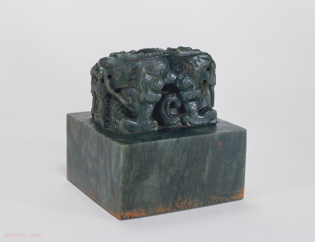 “心愿符初”玺,清乾隆,碧玉质,交龙纽方形玺,汉文篆书。面9.7厘米见方,通高10.3厘米,纽高5.2厘米。 此为乾隆帝晚年所制宝玺。乾隆帝晚年,训政之暇,还经常沉浸在对自己一生辉煌历程的回味之中,津津乐道于“得遂初心”、“心愿符初”,在回味中得到了巨大的满足和精神寄托。乾隆帝晚年多次提到有关“心愿符初”的事情。比如:“朕自御宇初年,即焚香敬告上苍,若纪年周甲,当传位嗣子,不敢仰希皇祖,以次增载之数。节经明降谕旨,宣于中外,今敬迓洪厘,幸符初愿,新岁大廷授玺。”“纪元周甲,心愿符初,今岁元正大廷授玺,称太上皇帝,幸为千古全人。”“朕今寿望九秩,精神康健,视听未衰。若来岁归政,遂思自暇自逸,竟至天下重务于不顾,则非所以敬承天眷,亦非御极初年定期归政,不肯恋位之初心矣。”“自丙辰元日授玺,心愿符初,迄今已阅三年。”通过以上引文,可知乾隆帝所谓 “心愿符初”,大致有以下两个方面的含义:其一,纪元周甲。作为皇帝,御极天下六十年,是很不容易的事情。乾隆帝虽口口声声强调“不敢仰希皇祖,以次增载之数”,但实际上其享国已经远远超过了康熙帝,这是他从未明言的心愿。其二,授玺归政,称太上皇,从而有资格同历史上的贤主明君比较,堪称“古今帝王第一”。此玺正是在这样的背景下刻制的,充分反映出乾隆帝的晚年心态。 碧玉是新疆和阗软玉中的一个品种,软玉主要有白玉、青玉、碧玉、墨玉、黄玉等品种。其中碧玉色如菠菜叶,略有透明感,呈油脂或蜡状光泽。由于所含成分不同,颜色和结构均不如其它软玉均一,色彩淡的呈菜色,色彩深的呈墨绿色,还有斑杂的大环斑状。 帝后宝印的纽制之一。其纽形为两条相向的龙躯体合二为一。 全称太上皇帝,即皇帝之上的皇帝,一般由在位皇帝的父亲充任,是皇权与父权相妥协的产物。在大多数情况下,做太上皇的人先做皇帝,然后将帝位让给儿子(当然也有例外)。此种让位,古代称为“内禅”,以示与因将帝位让于异姓(实际上是被武力篡夺)从而导致改朝换代的“禅让”不同。“太上皇”一词最早出现于秦代。秦王赢政统一中国后,自号始皇帝,追封其父秦庄襄王异人为太上皇,实际上异人并未当过皇帝。第一个真正的太上皇是后凉太祖吕光,公元399年12月,吕光病重,于是将帝位让给儿子吕绍而自称太上皇。历史上最后一个太上皇是清高宗爱新觉罗·弘历,即乾隆皇帝,他在位60年后,于1796年自愿传位于嘉庆皇帝。 古代的干支记日法,以十个天干字(甲乙丙丁戊己庚辛壬癸)配十二个地支字(子丑寅卯辰巳午未申酉戌亥)组合成六十个词组,如:甲子、乙丑、丙寅、丁卯……等,用以记日。