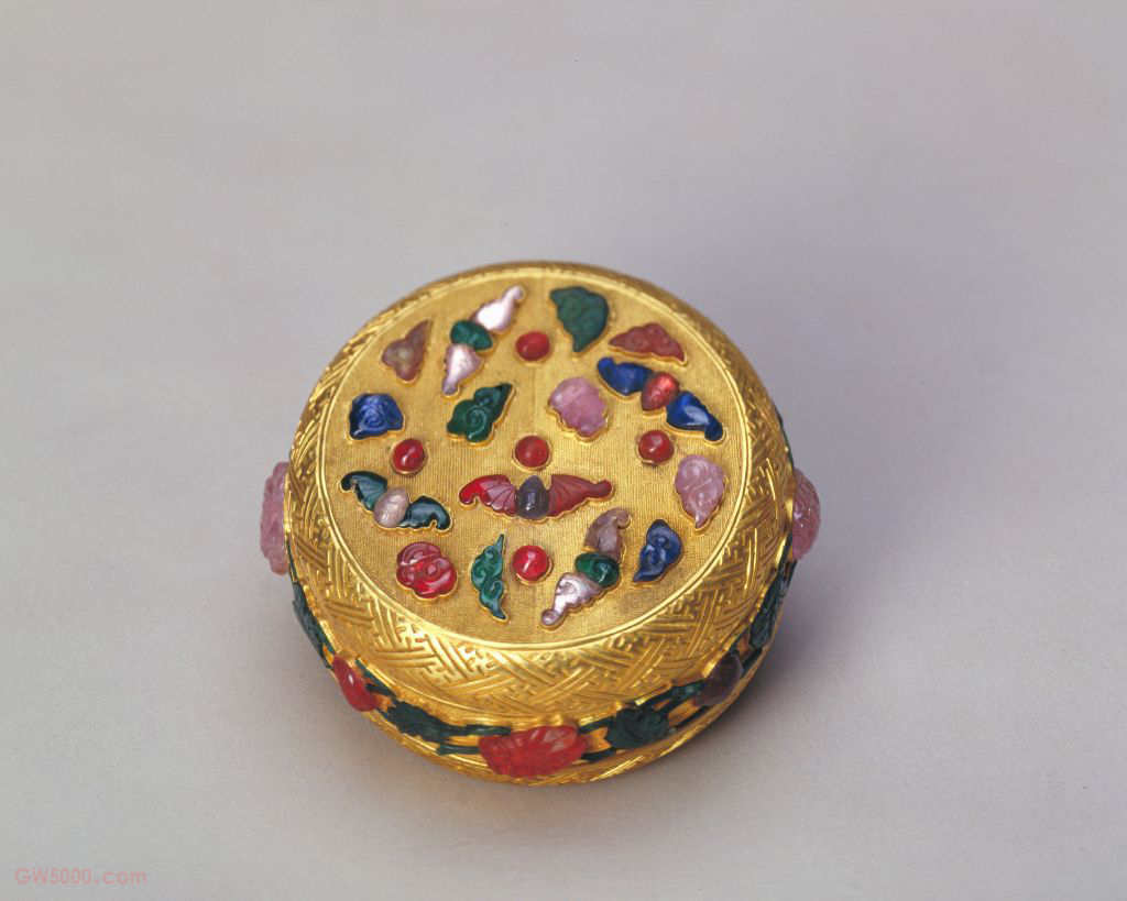 金嵌石圆盒,清,通高4.1厘米,径7.5厘米。 盒为九成金质,圆形。盖面錾刻米珠纹锦地,其上以粉、绿、蓝、红等各色碧玺镶嵌朵云、蝙蝠图案。盖边镶嵌碧玺菊花纹。盖的折沿处及盒身底边錾刻变形的“卍”字不断纹。盒底部有“宝华”、“足金”戳记。 在清代宫廷中,此种盒一般为后妃们用于盛放胭脂等物品。此盒的錾刻工艺极其精致,并镶嵌各色碧玺组成图案,更显珍贵。金属工艺的一种。即用工具剔除地纹,使纹饰轮廓线凸起。錾金工艺技法早在商代就已出现,到清代,被广泛地运用于各种金属工艺品上。锦原为丝织物的种类名,花纹精致古雅。漆器上所谓锦地,是指用漆填或描绘出华美的纹样作衬地,其上再饰各种图案。 宝石名。据传源于波斯语“披及札基”的谐音,所以古时又称披耶西、碧霞玺、碧霞玭、碧霞希及碧洗等,即今日的“电气石”宝石。古籍记载碧玺产于缅甸,现我国新疆、内蒙古等地的伟晶岩中均产有各色碧玺,其中以新疆阿勒泰所产碧玺最为著名。 我国古代金工传统工艺之一。铸造铜器时,在需镶嵌部位表面铸成线槽,将松石、红铜片或金银丝、片嵌入凹槽,再打磨平滑。镶嵌工艺始于二里头文化时期,在春秋时期较盛行。 传统装饰纹样之一。常与梅、兰、竹一起被喻为四君子,为文人所喜爱。 金器含金量有多寡之别,足金原指金器中含金量最高的成色。这里指生产和出售的金制品上成色的标志。雕漆主要工艺之一,又称雕工。即先在器物上髹漆若干层后,再凭漆之厚度来雕刻花纹。